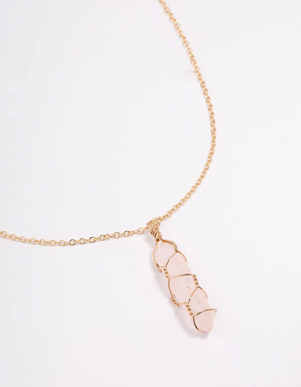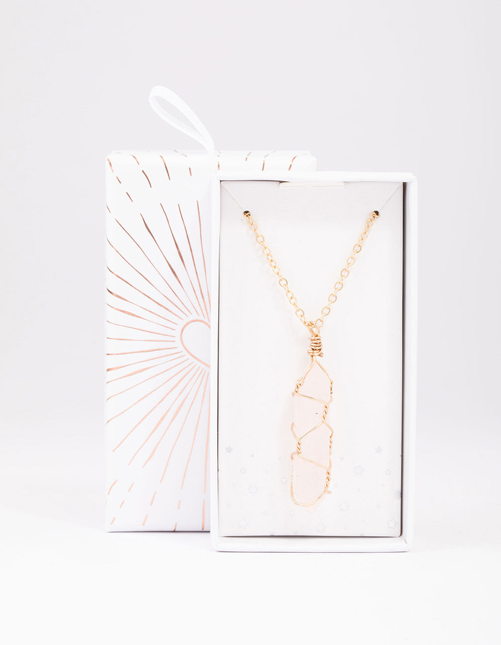 This gift box contains one gold-toned necklace featuring a tapered, clear quartz pendant for a natural look.