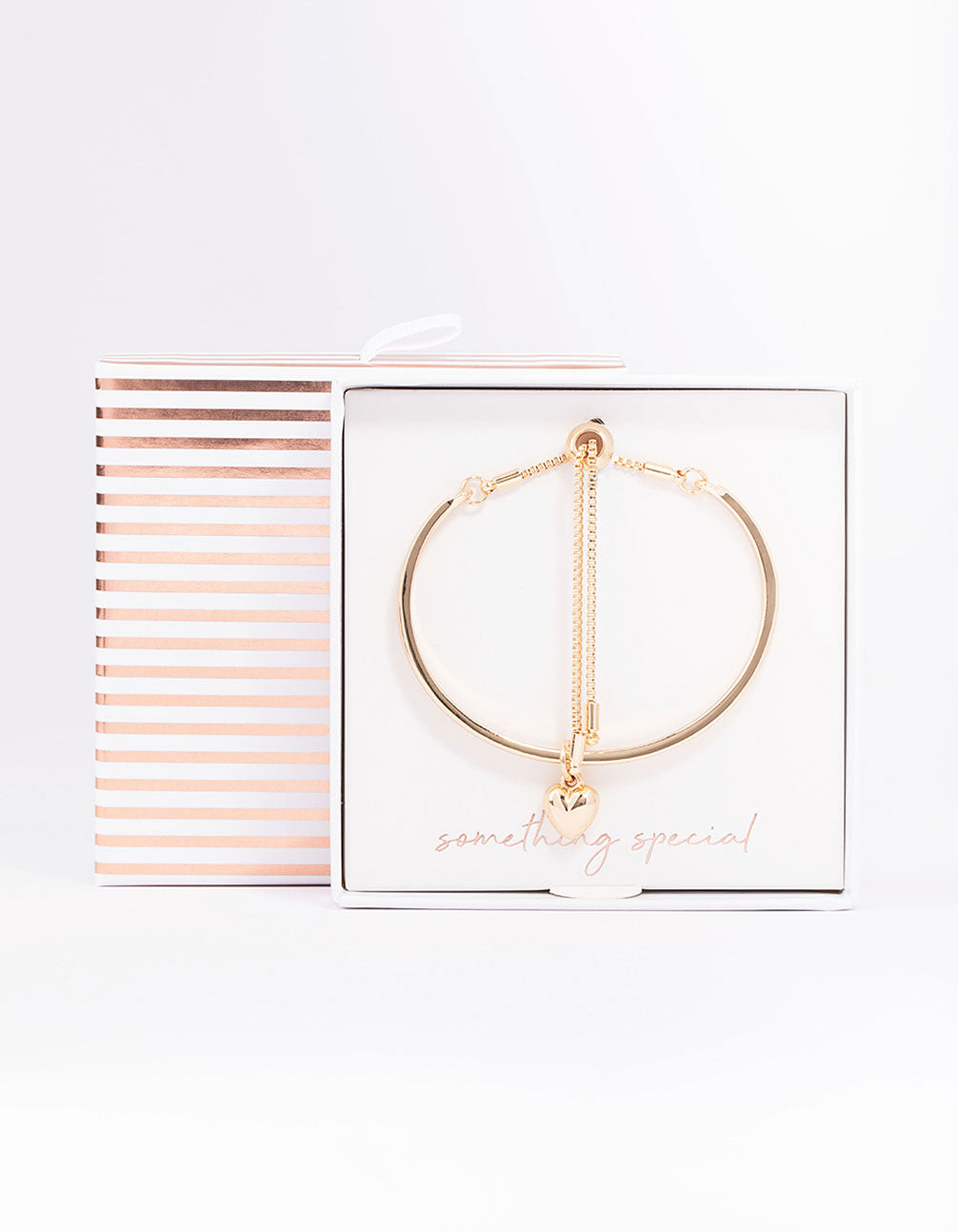 This gift box contains a simple gold toggle bracelet adorned with a solid heart charm for a lovable look.
