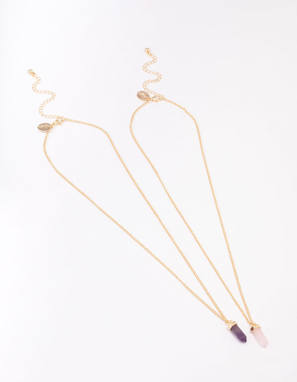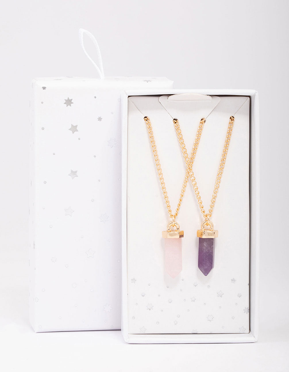 This gift box contains two gold-toned necklaces featuring rose quartz and amethyst pendants for an organic look.