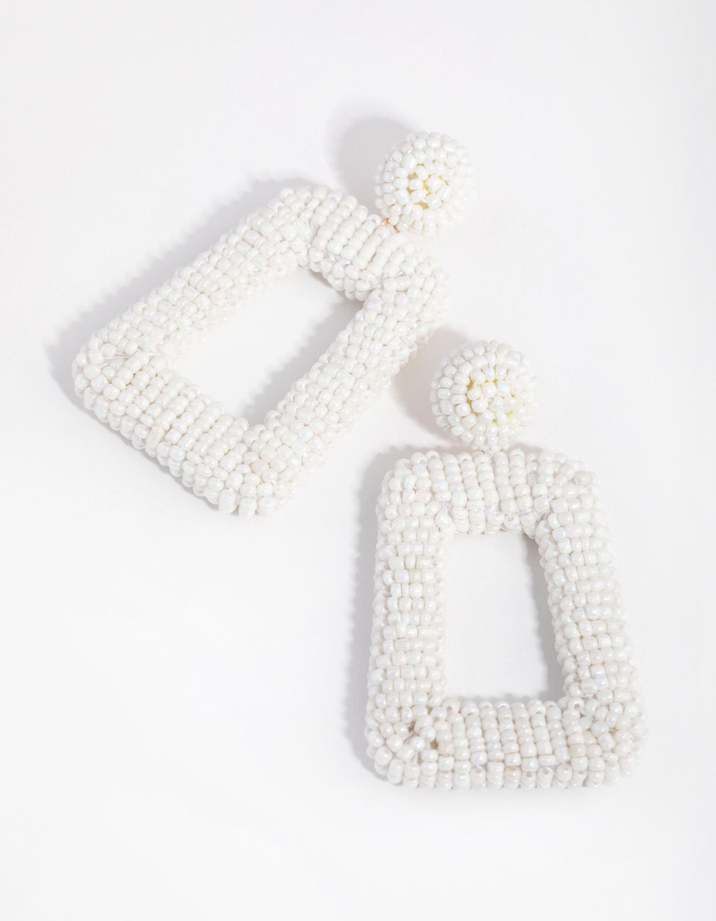 Evoke sunset strolls along the beach with these dreamy earrings. They feature a large,white, seed bead trapeze design. This is the perfect statement piece, wear them and get noticed!