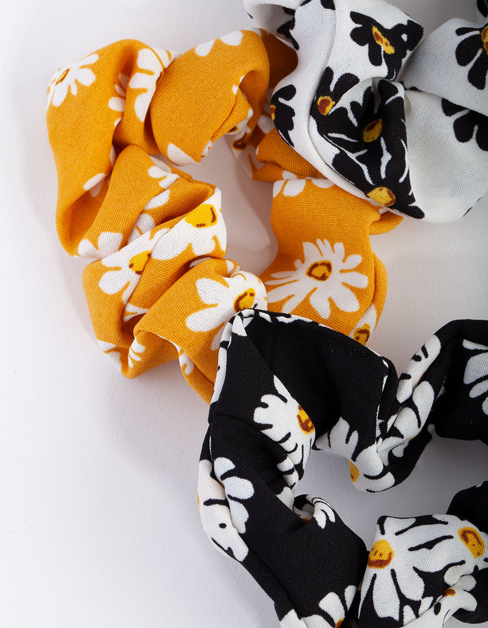 Scrunchies are back! Enjoy a 90s throwback with a classic scrunchie, and take comfort in that they're great for your hair's health. This pack comes with three daisy-patterned scrunchies in white, black and mustard.