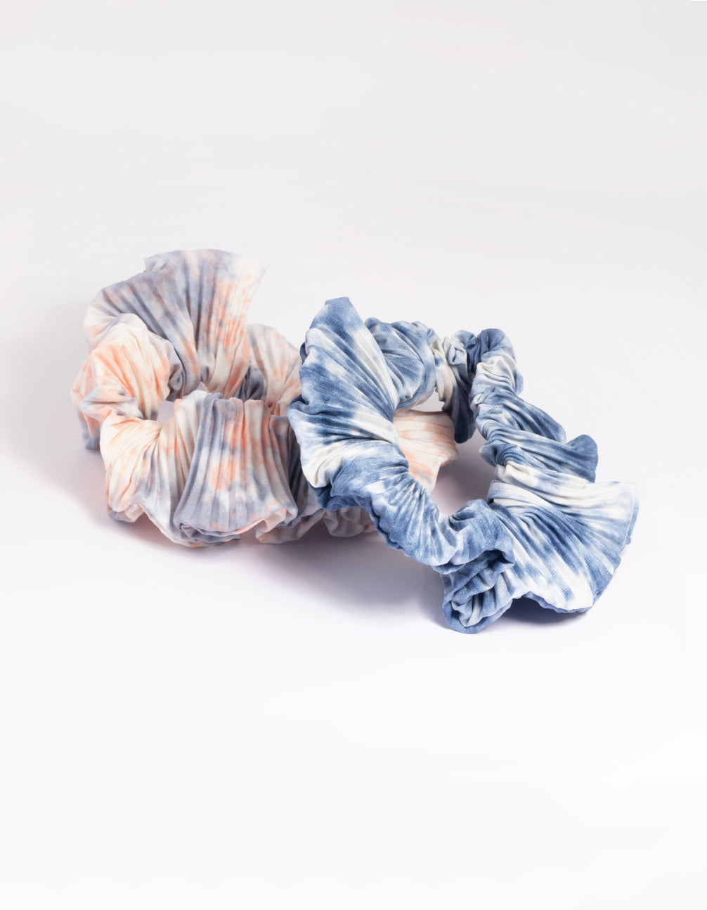 Step into the 90s with funky scrunchies! This scrunchie set boasts two hair ties with a pleated design and a tie dyed pattern. Super cute!