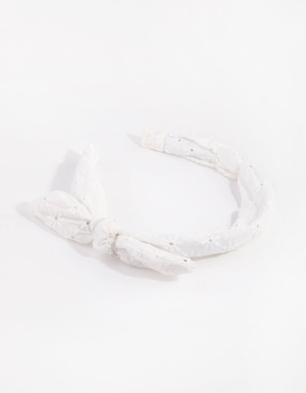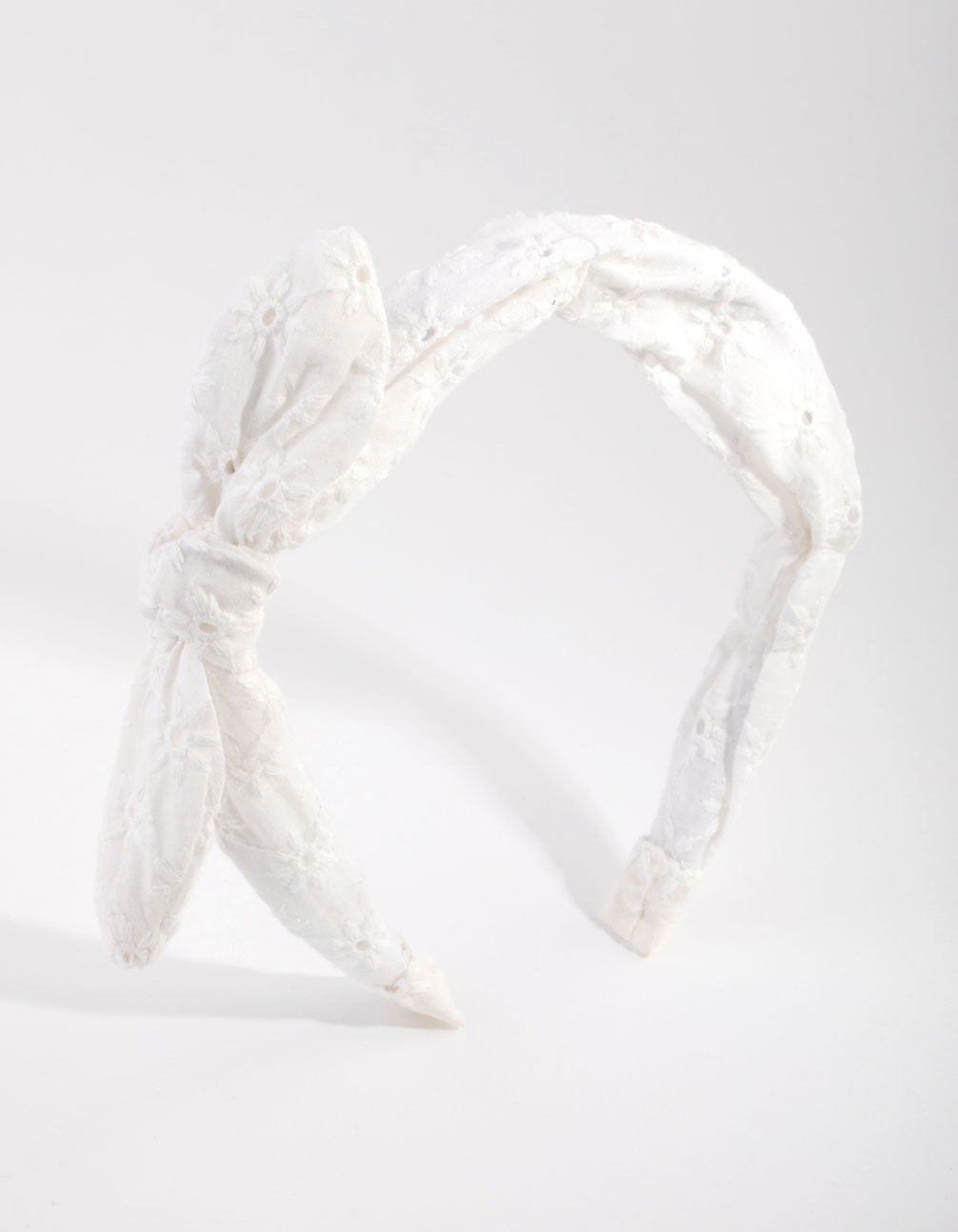 Hair accessories are a great way to elevate your hairstyles. This headband features a pretty, white, fabric design with floral cut-outs and a large twisted bow at the side. Cute!