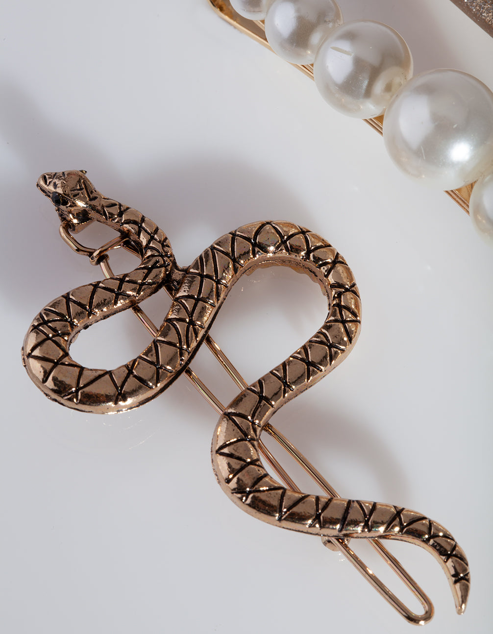 Whether you are heading to brunch, a wedding or just wanting to look glamorous for a party, this hair accessory is the perfect way to complete your event ensemble! This three pack features a pearl, snake and glittery acrylic hair clip
