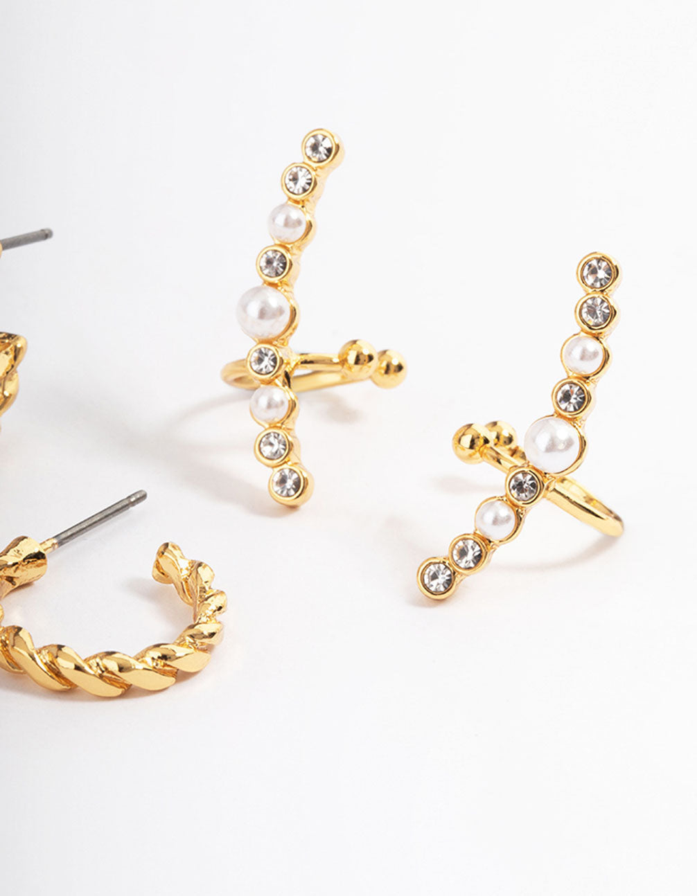 Gold Plated Pearl Diamante Cuff & Double Hoop Earring Pack