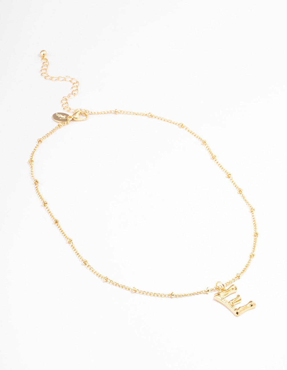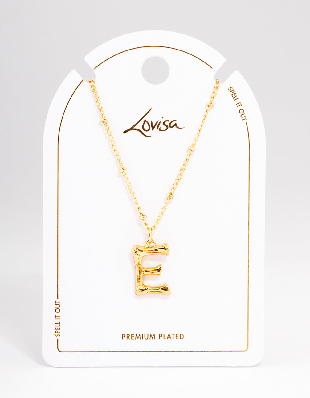 - This letter 'E' initial necklace is made with real gold plating and features an intricate, bamboo-inspired texture for a unique finish. Style this necklace with a zodiac ear stacker for a curated finish.