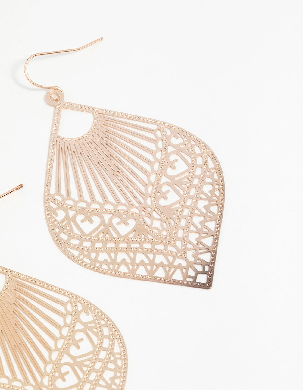 After out own heart! This adorable pair of earrings feature a rose-gold-toned delicate cut out setting with heart designs. Add some romance to your look with this dreamy design.