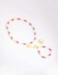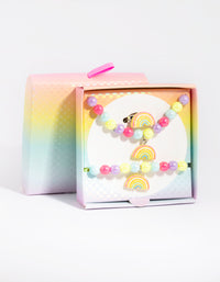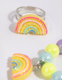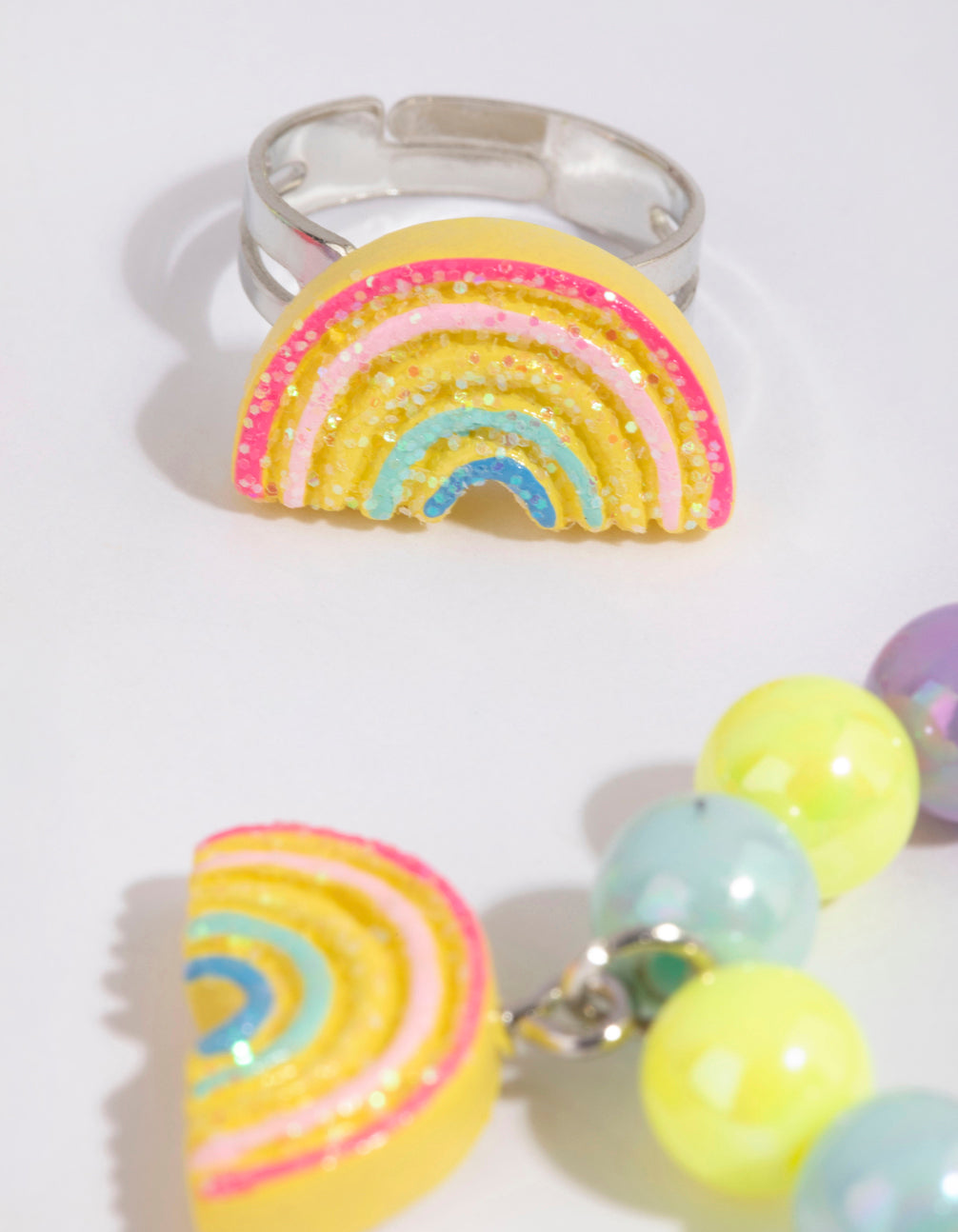 This cute jewellery pack includes a necklace, bracelet and ring. Each boasts rainbow charms and colourful beads.