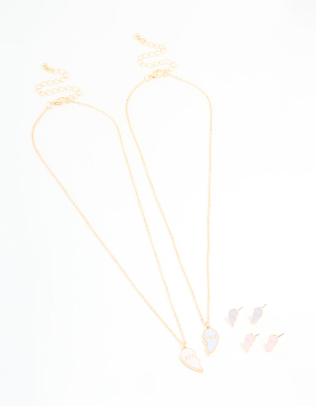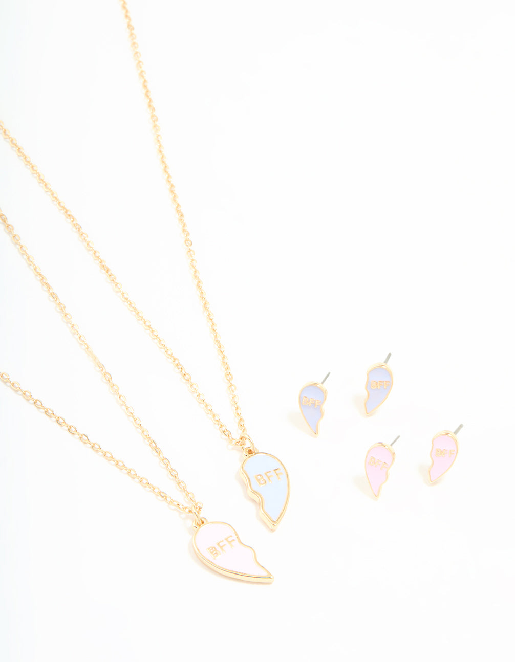 Make friendship sparkle with this Kids Gold BFF Necklace & Earrings Pack! This set includes two gold-toned pendant BFF necklaces and two pairs of matching stud earrings, perfect for kids who love sharing their style with their bestie. The necklace features a cute design that's easy to pair with casual outfits or dressier looks, while the earrings add a touch of charm to any ensemble. Whether it's a school day, a birthday party, or a family outing, this matching set is ideal for everyday wear or special occasions. Thoughtfully designed for kids, this jewellery set makes a wonderful gift to celebrate friendship or simply add a little shine to their wardrobe! Perfect for layering, mixing, or wearing as a complete set, it's a fun and stylish choice they'll love.