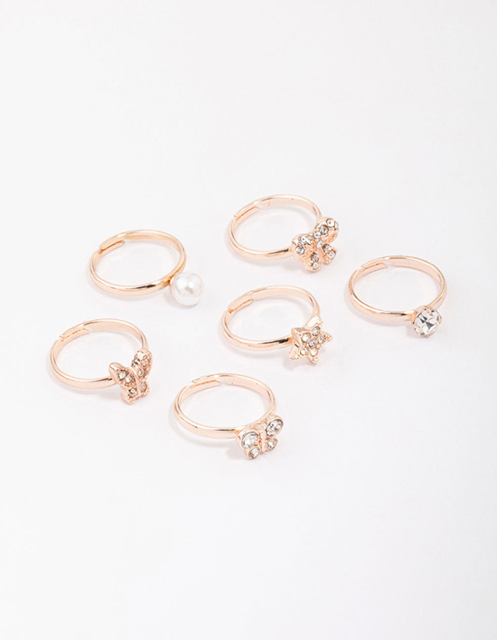 Embellish your look with this set of dainty stacking rings! This ring pack includes six adjustable rings with a warm, rose gold setting.