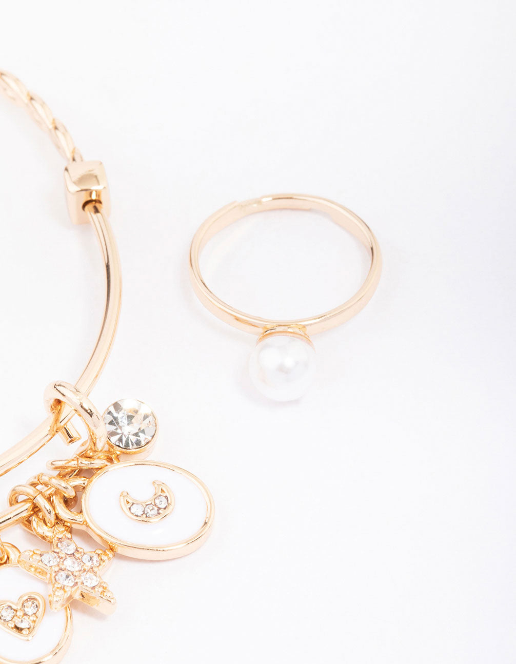 Let your little ones adorn their look with this gorgeous, gold-toned jewellery set. This matching kids set features a twisted charm bracelet and dainty ring, adorned with a pearl.