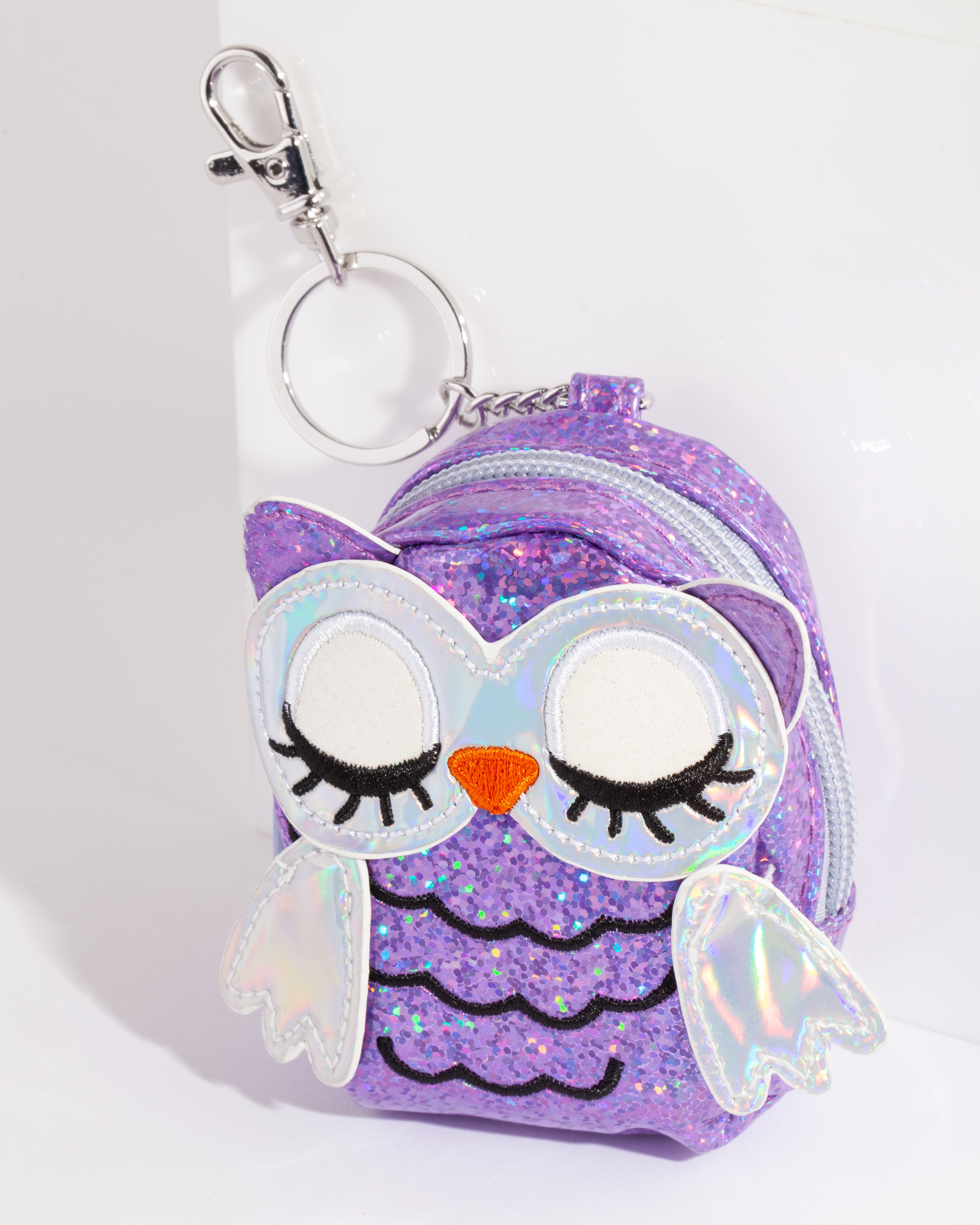 Keep your valuables safe in style! This kids‰۪ purple iridescent purse keyring boasts a fun owl design.
