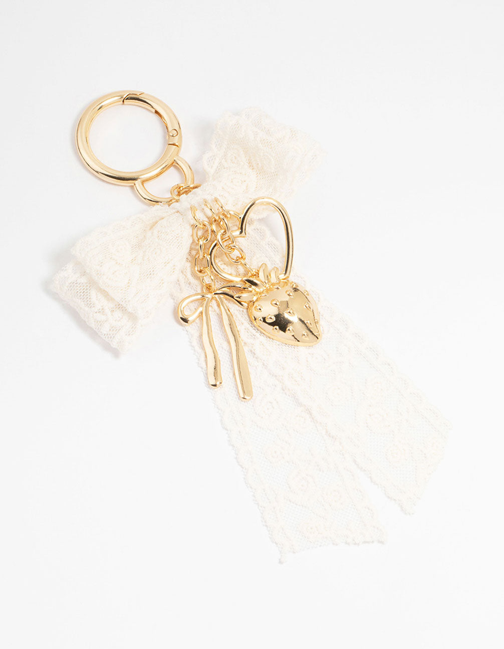 Meet this Lace Bow & Gold Heart Fabric Keychain. Featuring a delicate lace bow and a shiny gold heart charm, this stylish accessory is more than just a keyring. Clip it onto your bag for a playful twist or use it to keep your keys looking chic.