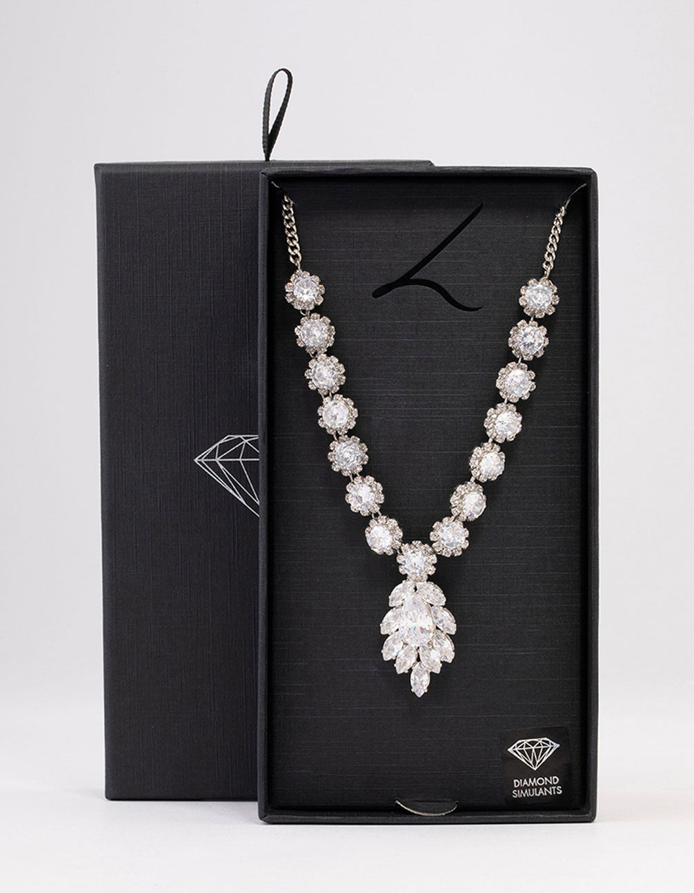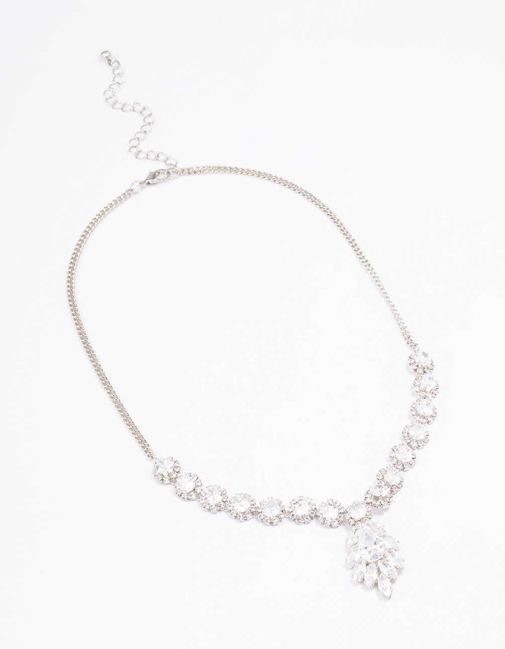 - TThis elegant necklace features a shiny silver setting adorned with floral cubic zirconia crystals for a glamorous finish.