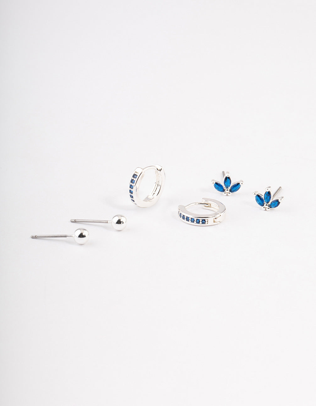 This Silver Plated Brass Cubic Zirconia Marquise Stud & Huggie Earrings 3-Pack includes three sets of stud and huggie earrings featuring a marquise stone design for an elegant finish.