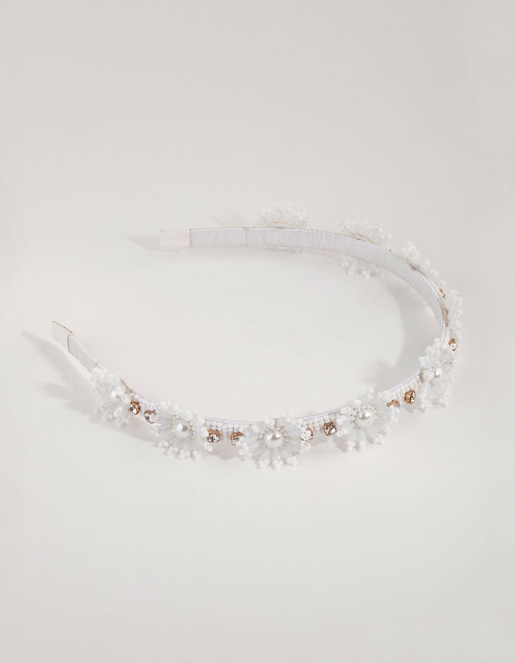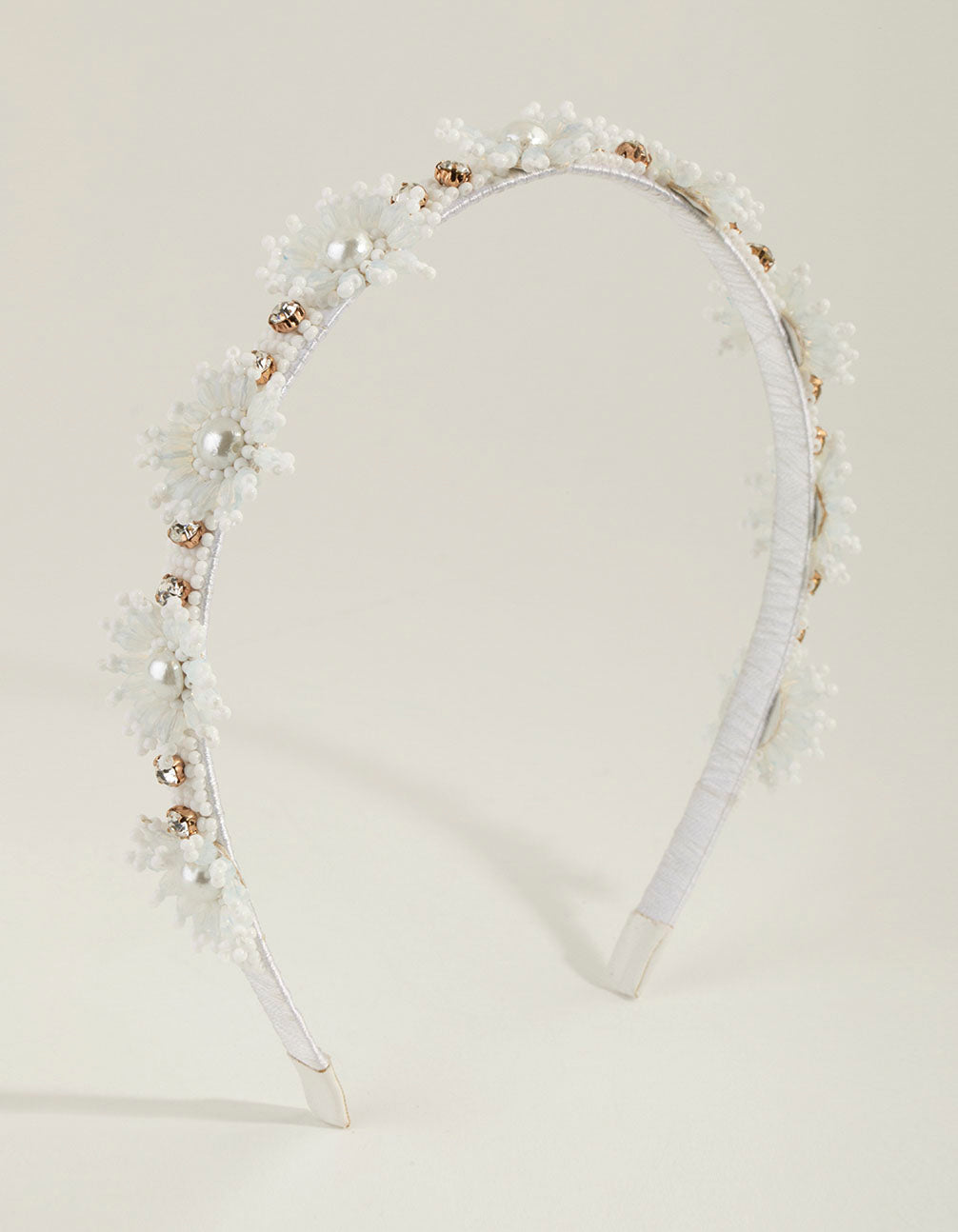Complete your formal look with statement embellished headbands. This beautiful white alice band features a fine band with a lovely seed bead design. The pattern boasts a series of beaded flowers, which are stationed around the band and interspersed with diamantes in a gold-toned setting. Wear this for a soft, pretty look.