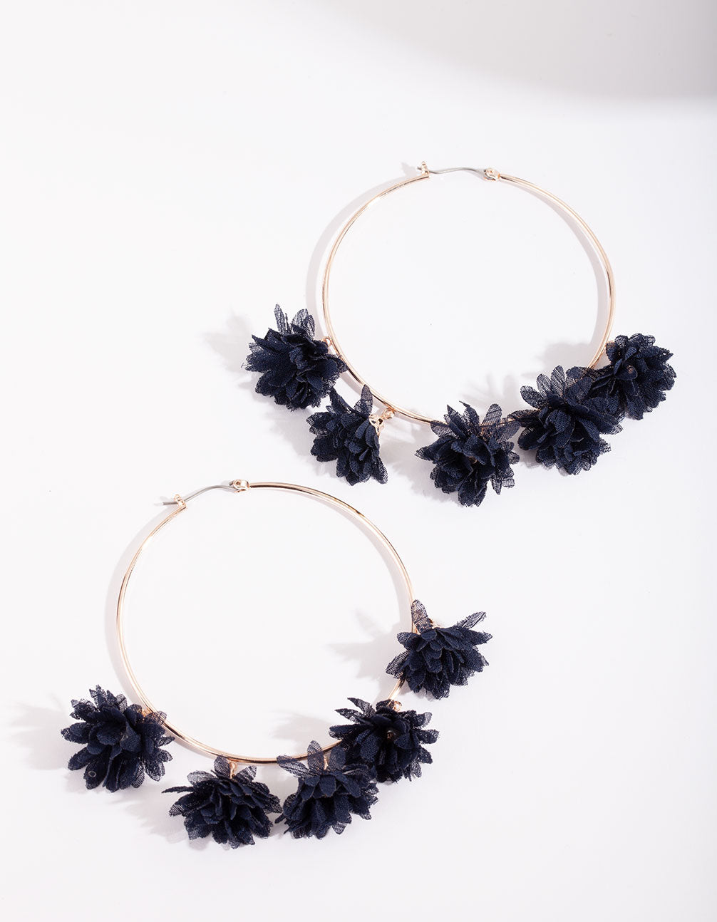 Statement earrings have become the easiest way to switch up any wardrobe. Conversation-starting styles mean that a new pair of earrings replaces the need for a new dress.These classic rose gold-tone hoops feature 5 navy fabric flower charms.