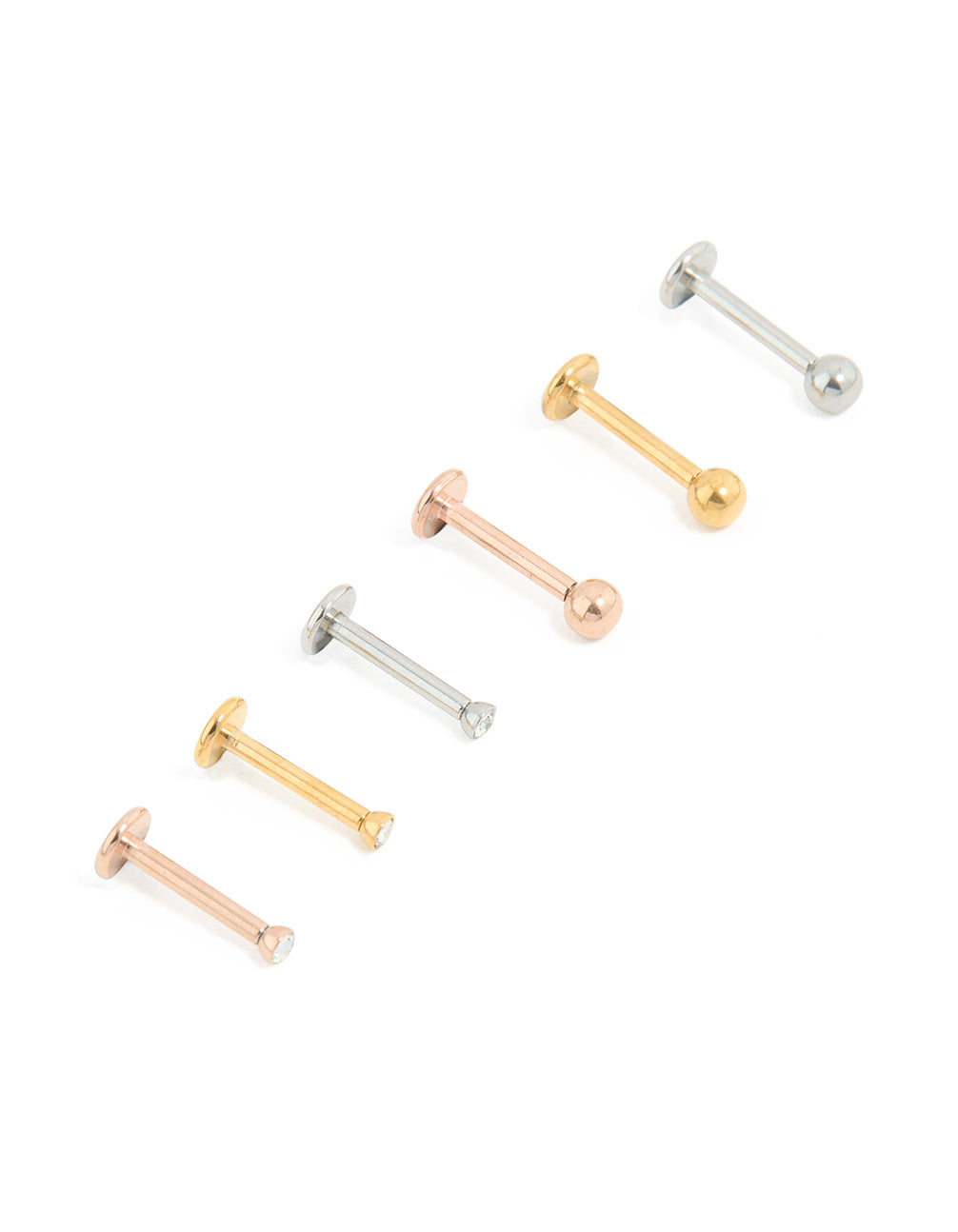 Enhance your everyday look with this Mixed Mini Diamante Surgical Steel Flat Back Studs Pack. These stylish flat back earrings are crafted from durable surgical steel and feature a mix of finishes, making them perfect for mixing and matching. Each stud brings a different mixed metal finish to your lobe, cartilage, or tragus piercings. Designed for comfort and versatility, these flat back studs are ideal for all-day wear—whether you're heading to a casual lunch, a night out, or simply elevating your everyday style.