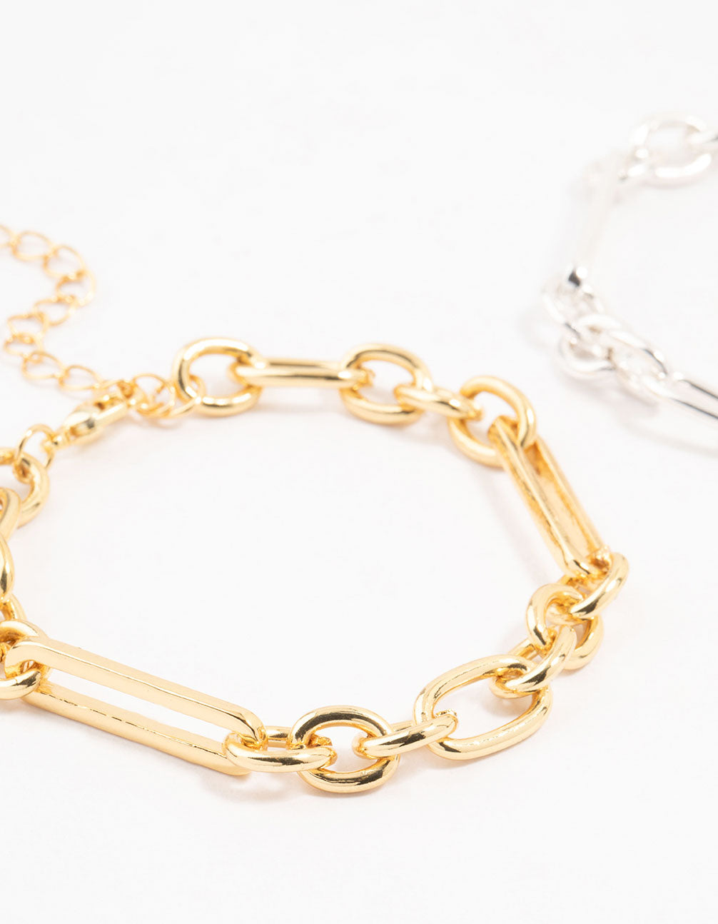 Upgrade your style with this gleaming 2-pack of mixed metals chain bracelets. Featuring premium gold and silver plating, they create a luxe, layered look for a trend-setting vibe. Slip on these sleek, versatile chains bracelets for a bold statement.