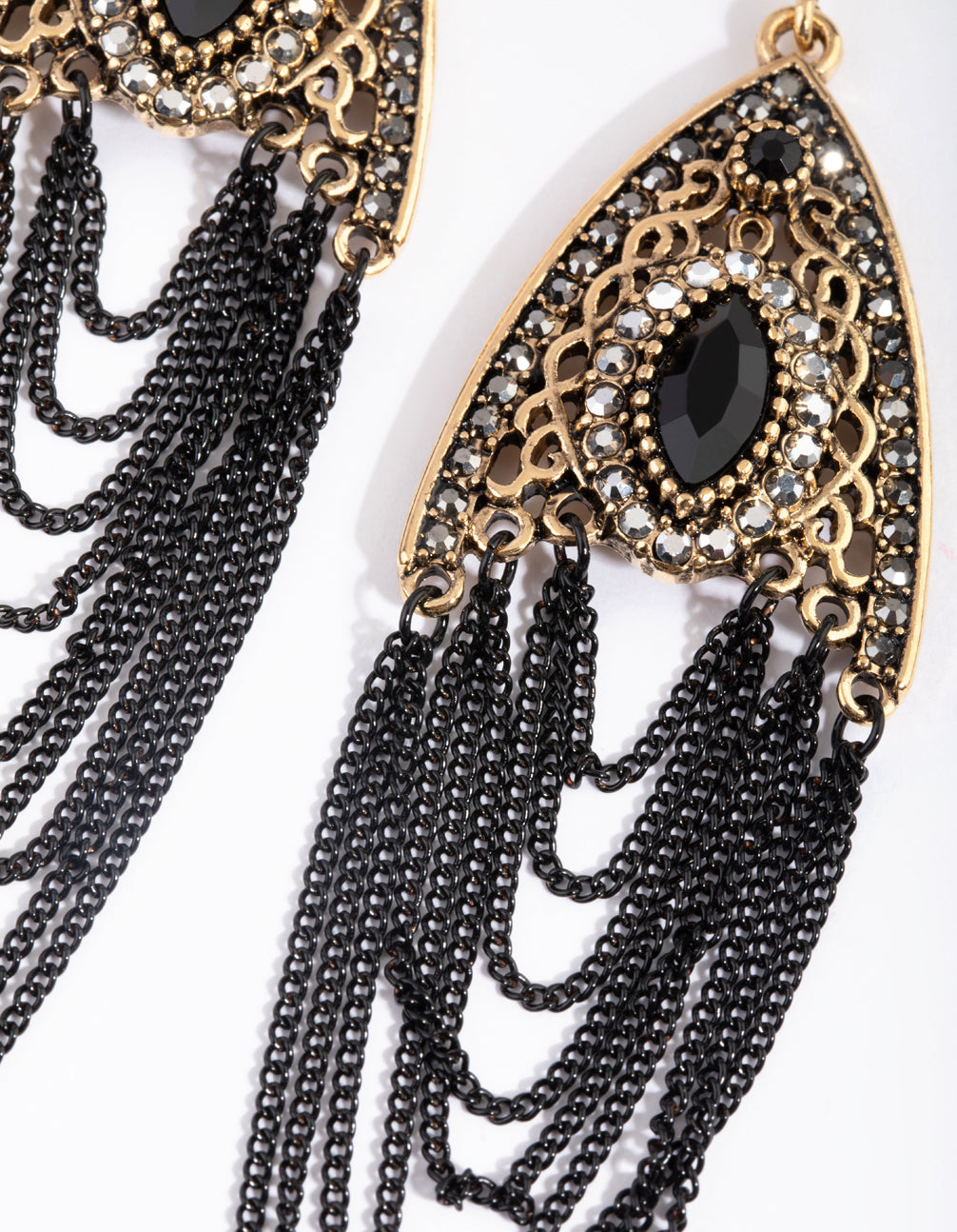 Sparkle the night away with glamorous earrings with a dramatic edge! Featuring a dark-hued setting with an eye-catching diamante studded design, these gorgeous earrings will take your evening look to the next level! Wear them with a pop of colour to embrace contrast, or pair them with darker hues for a mysterious look.