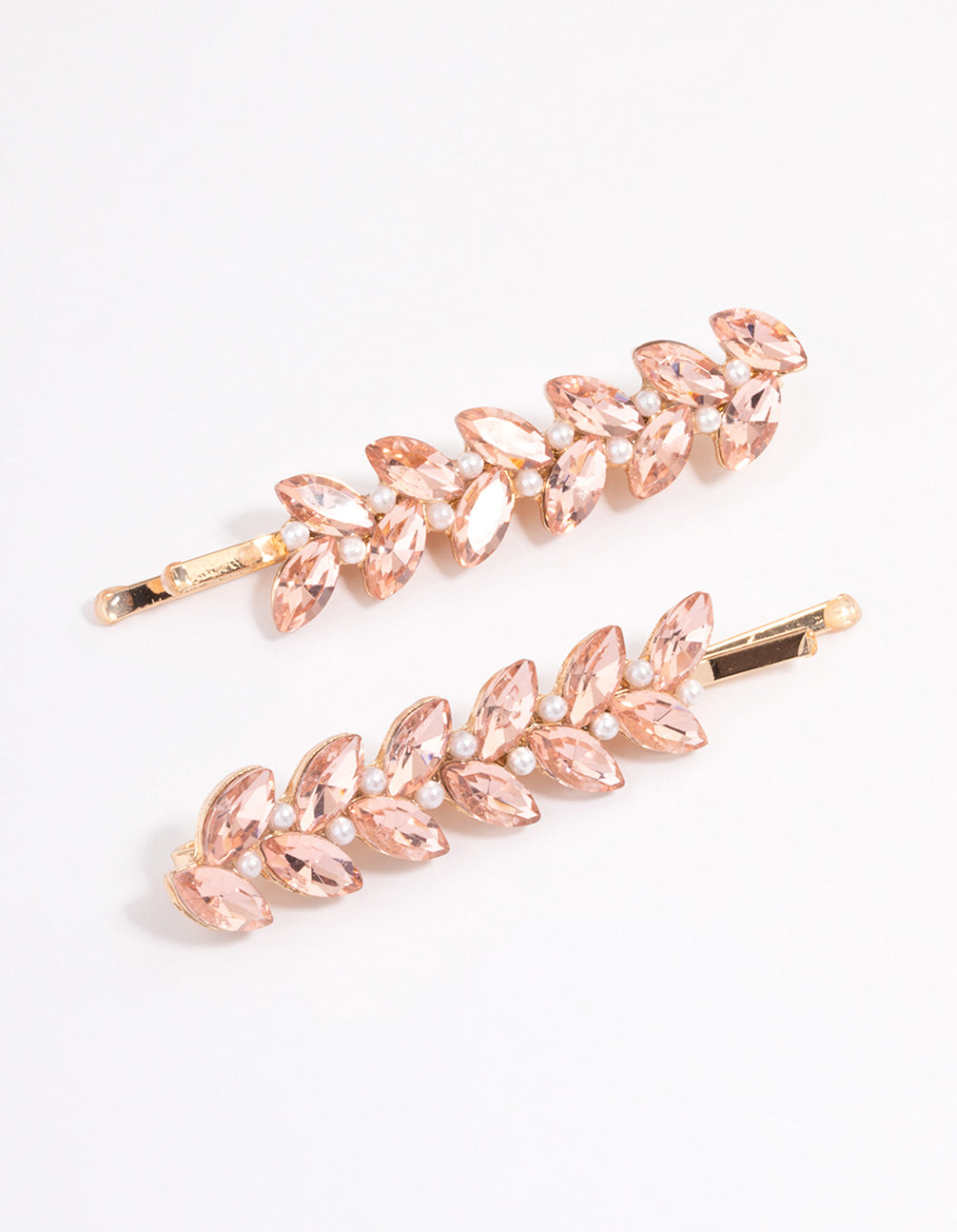 • This gold claw clip set includes two diamante and pearl navette style hair accessories that can elevate any up-do.