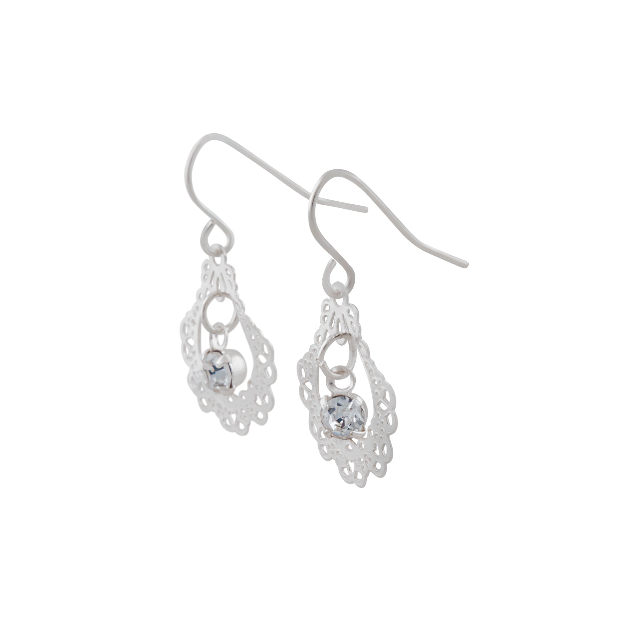 Ornate Silver Drop Earrings With Centre Diamante