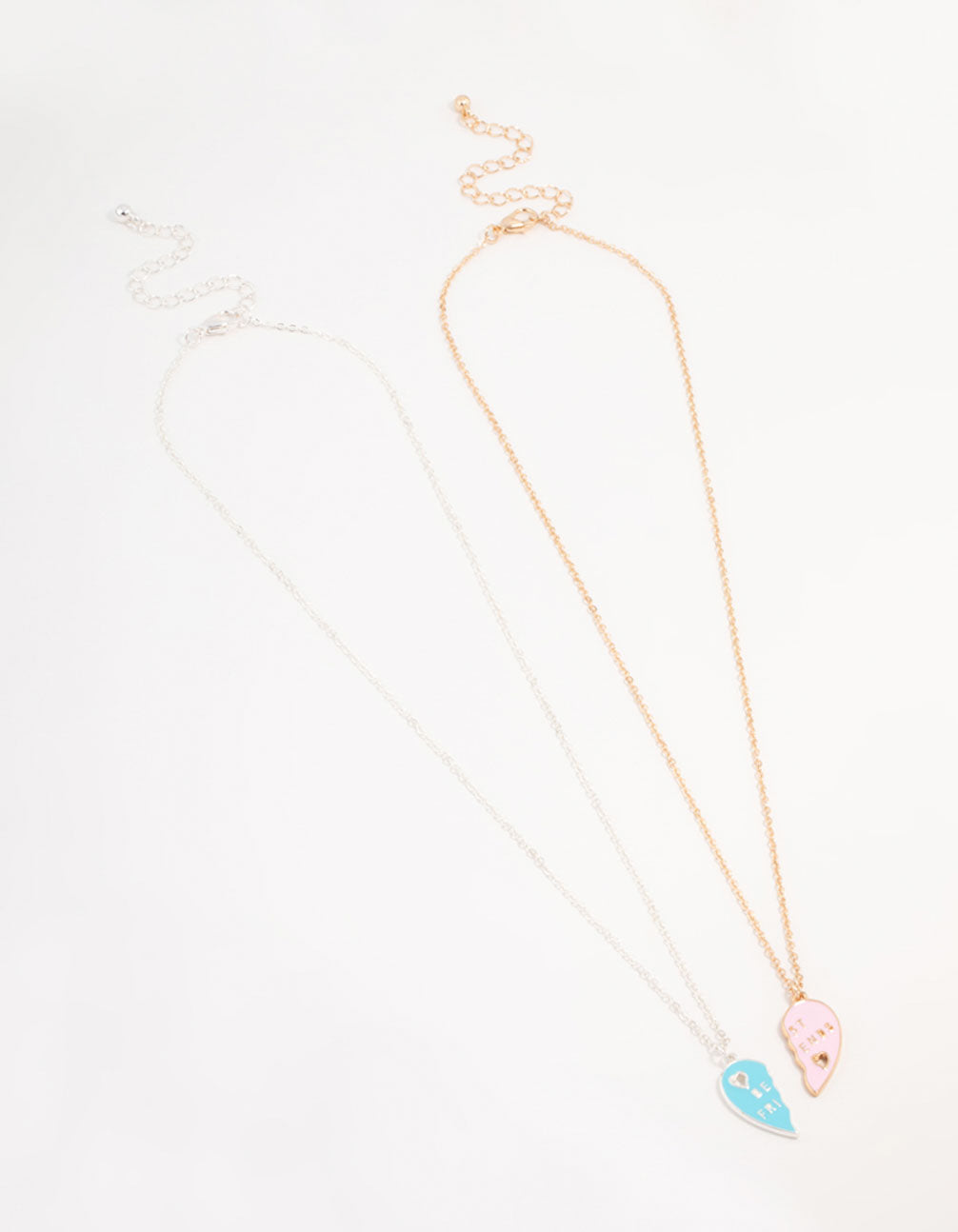 Celebrate your friendship with this charming necklace duo. This set features two heart pendants—one pink and one blue—that can link together. It makes an excellent gift for your best friend.