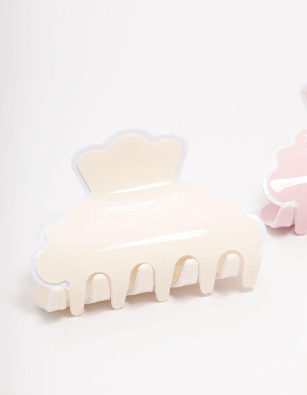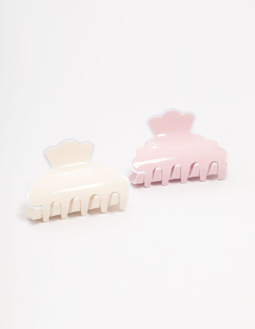 Enhance your style with this set of pink and cream acrylic claw clips. Featuring scalloped edges for a playful touch, these clips are designed for an effortlessly chic look. Simply pop them into your hair for a pretty finish.