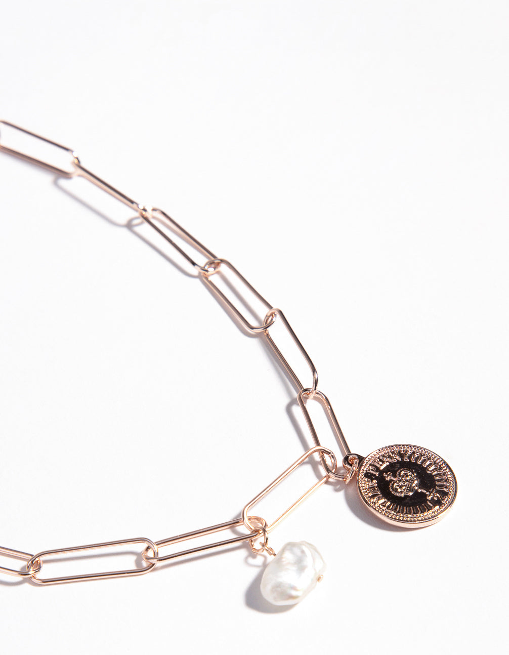 WeÕre lifting the chain game. This short rose-gold-toned necklace features large rectangle chains with a coin and pearl pendant. This can be worn with any outfit Ð so versatile!