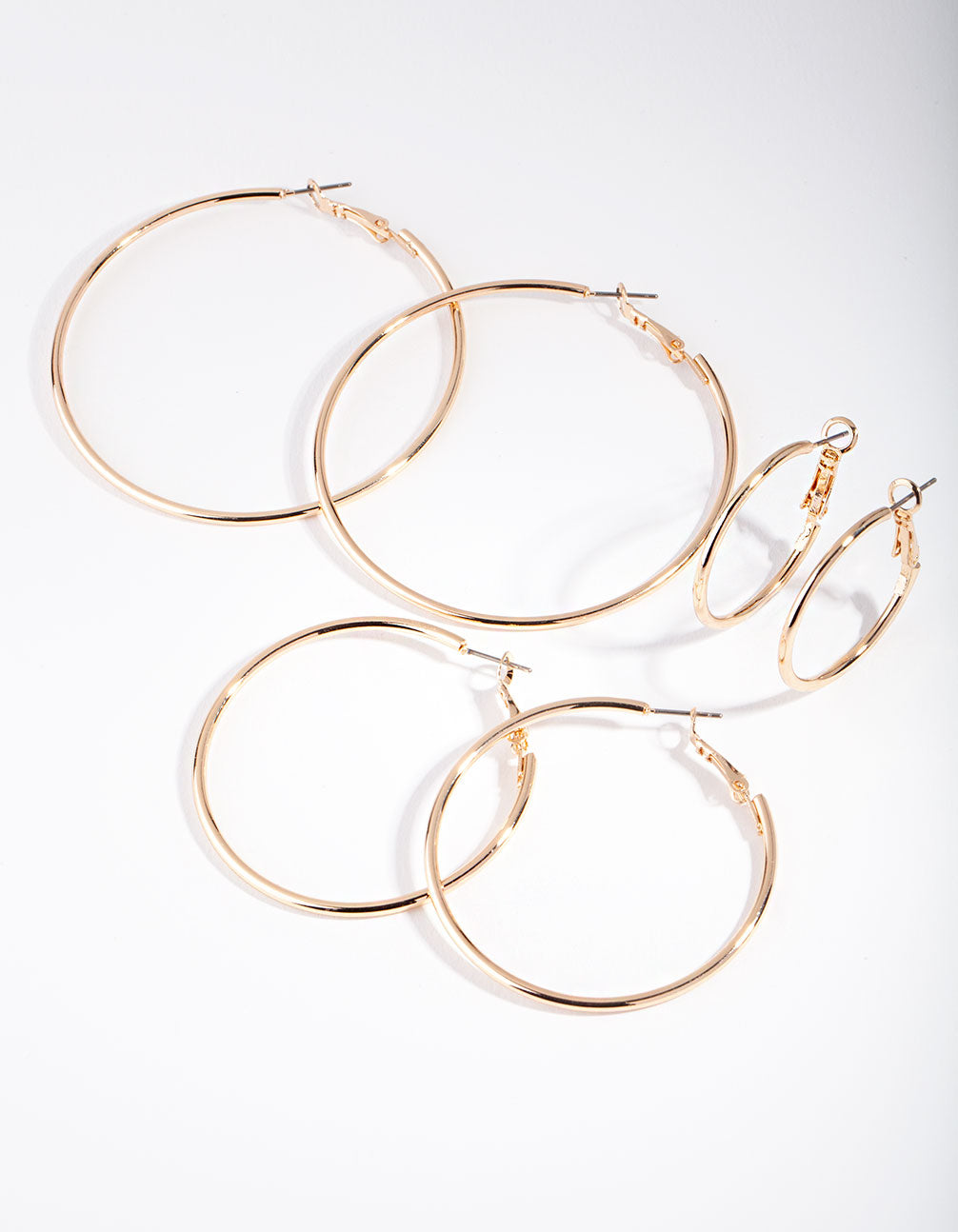 A collection of precious pieces handmade in the finest quality metal platings. This earring pack features gold plated graduating plain hoop designs.