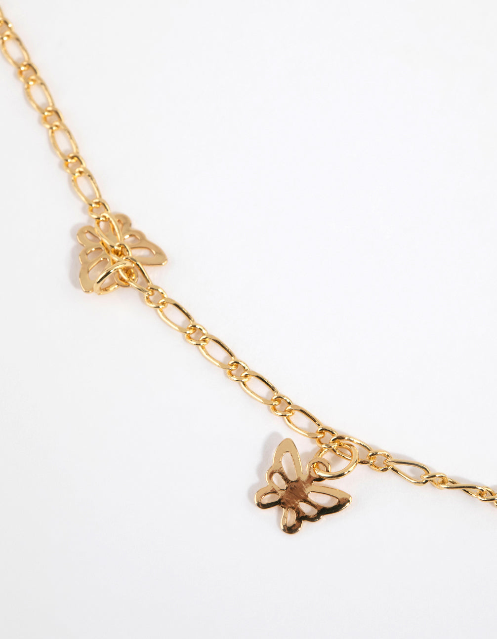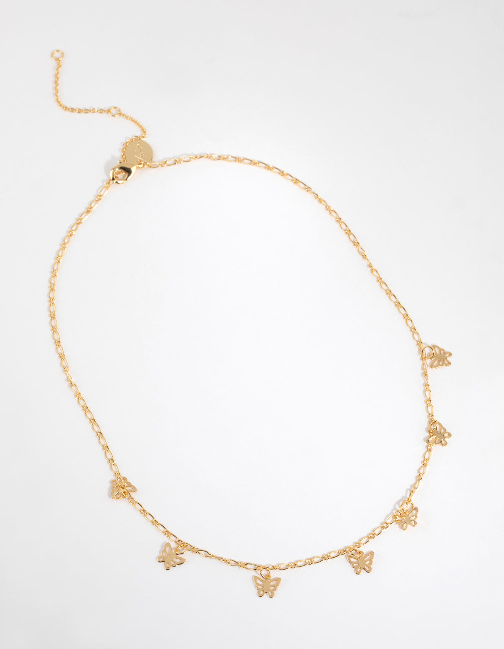 This beautiful necklace is plated with genuine gold for authentic lustre and shine. It features a fine long-and-short chain with a series of butterfly pendants.