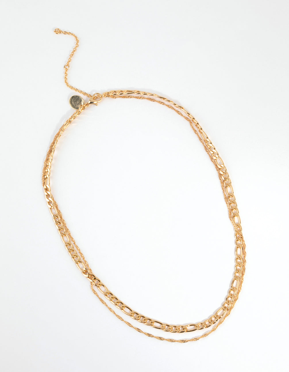 Classic chains will always be in style! This lovely necklace is plated with real gold for authentic lustre and shine. It features a layered design with a figaro and singapore chain.