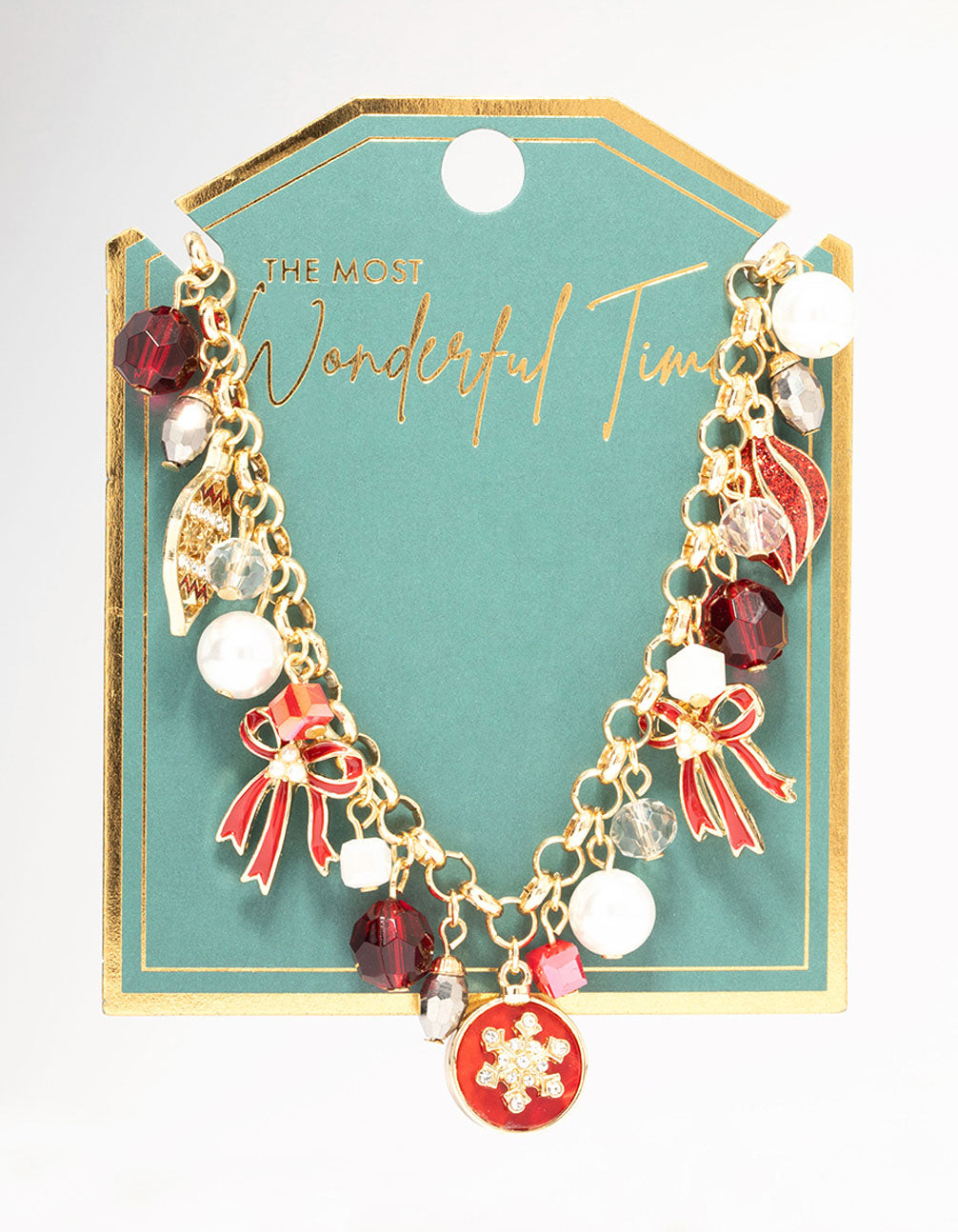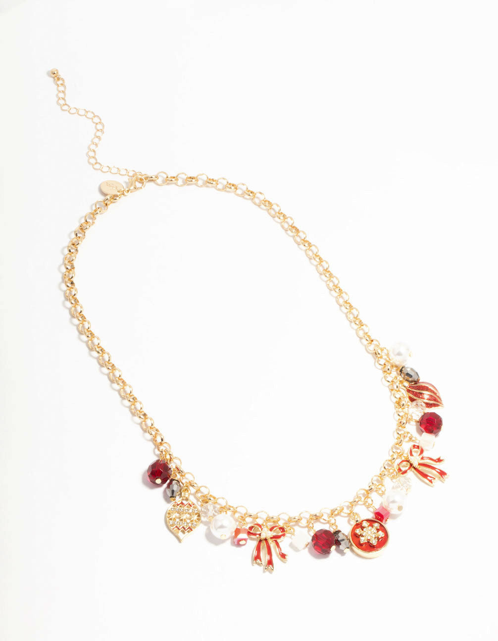 Deck the halls with this sparkling Red Bow Gold Charm Necklace. This charm necklace features different charms, including a red bow, a bauble, a snowflake, pearls, and beads.