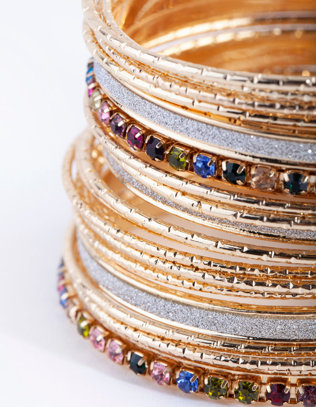 Texture is key to this pack of gold-toned bangles, which feature a variety of multicoloured stone and glitter designs.