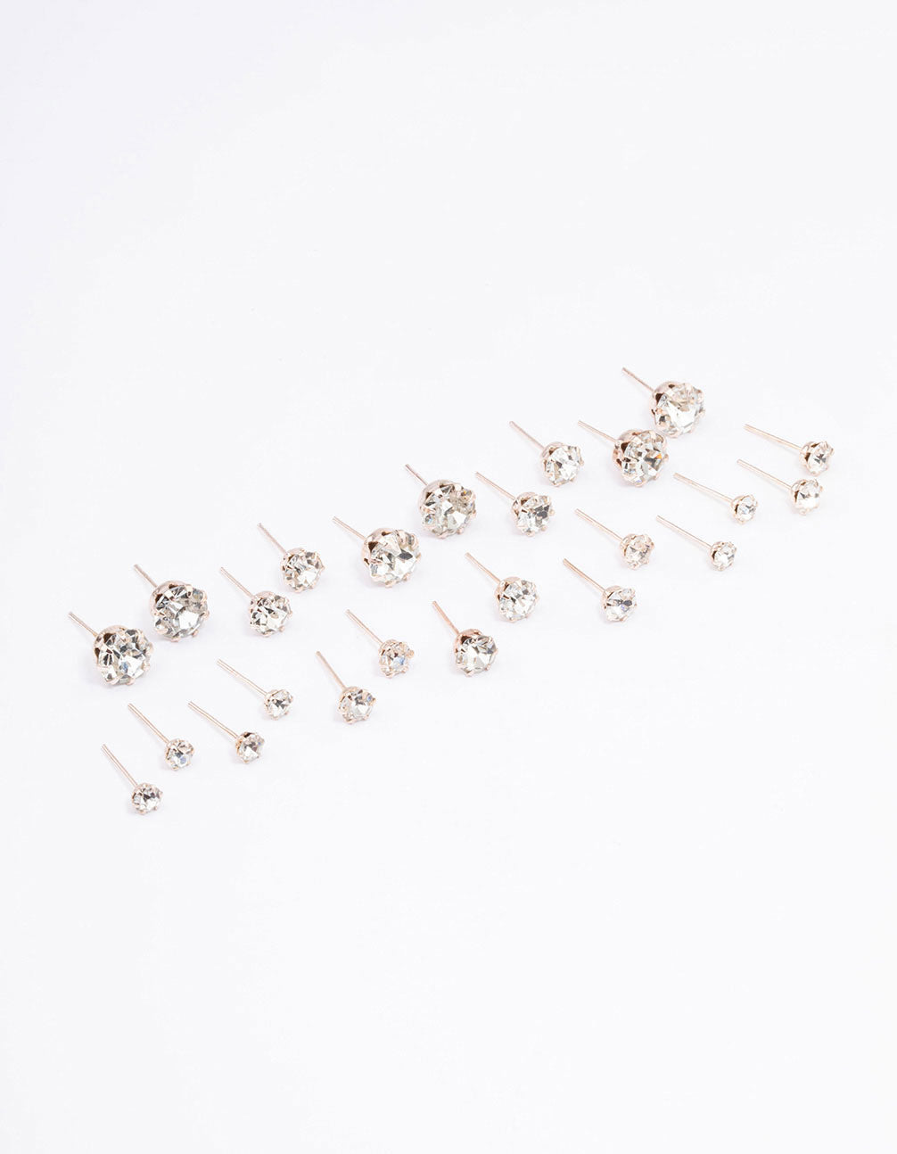 - Customise your stack with this set of twelve, rose gold earrings. This comprehensive pack features a collection of diamante, graduating earrings — perfect for versatile styling.
