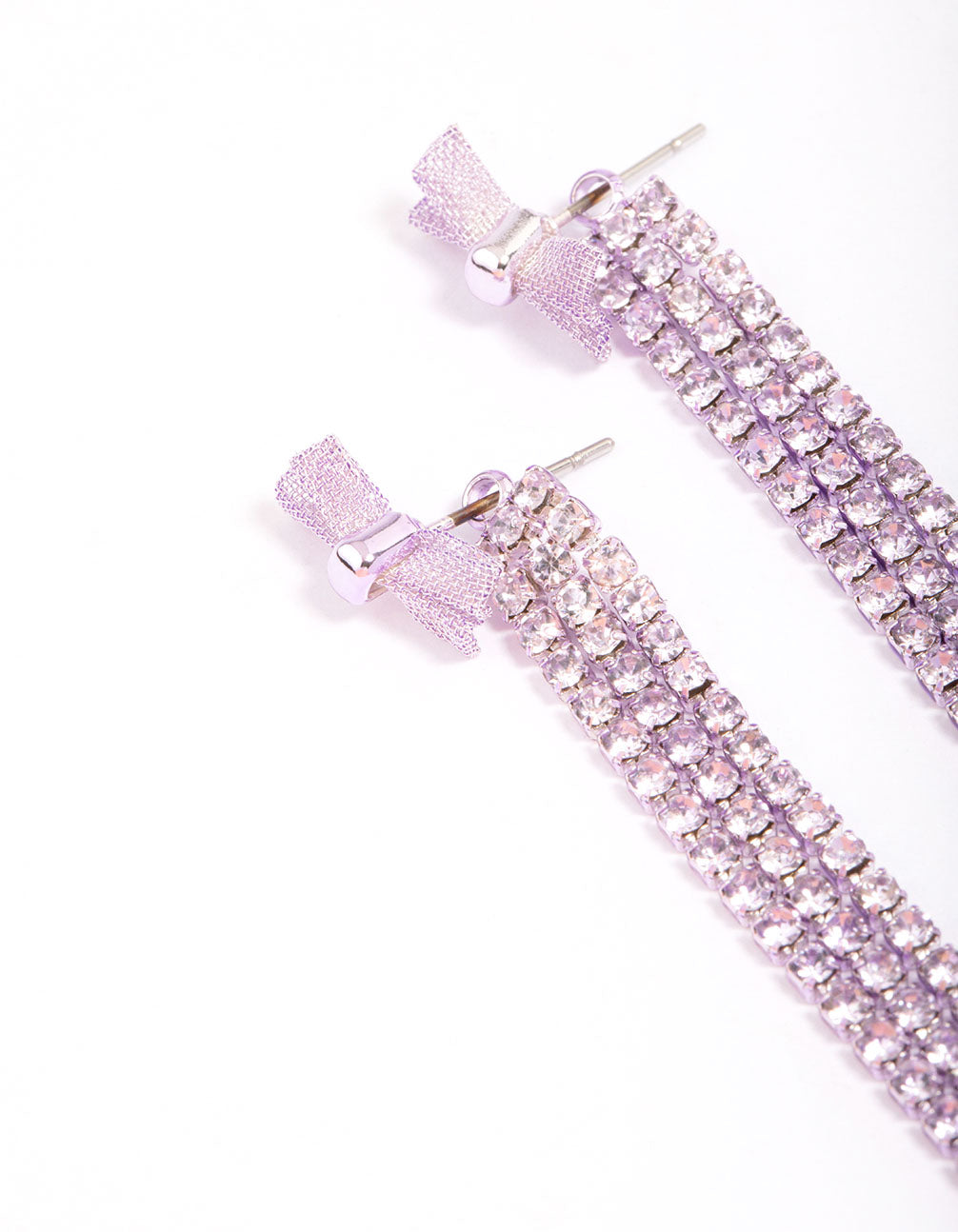 - Style these Lilac Bow Triple Row Diamante Hoop Earrings for a fun and whimsical look. The earrings showcase lilac bow charms and triple rows of dazzling diamantes, offering a playful and stylish addition to your outfit.
