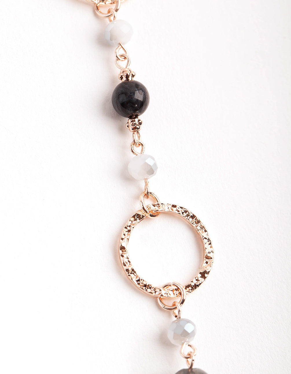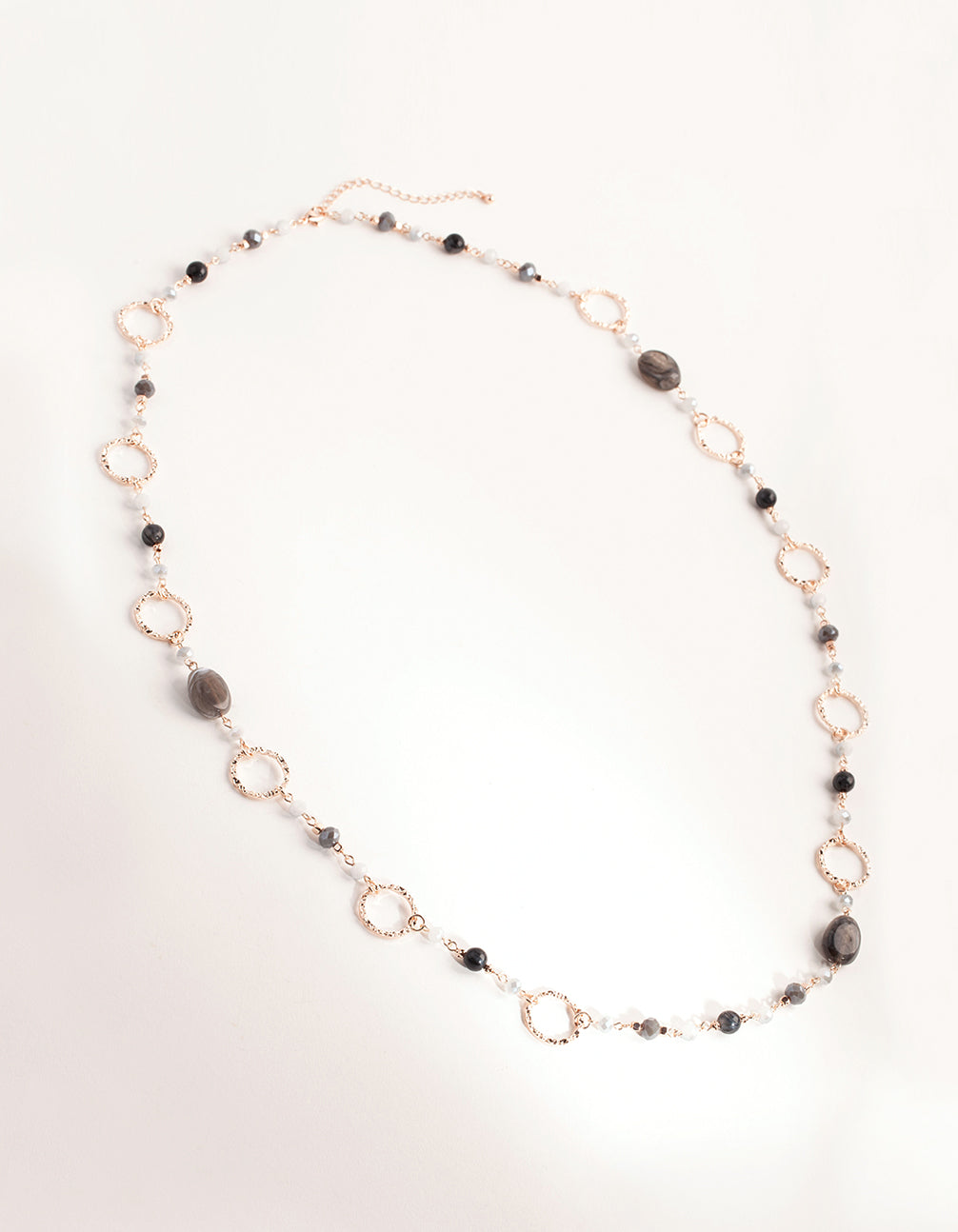 Make a statement with this pretty necklace. It's rose-gold toned, and features a mix of grey and beads and different metal details to catch the eye. It's long, so perfect for layering, or wear it on its own for a considered look.