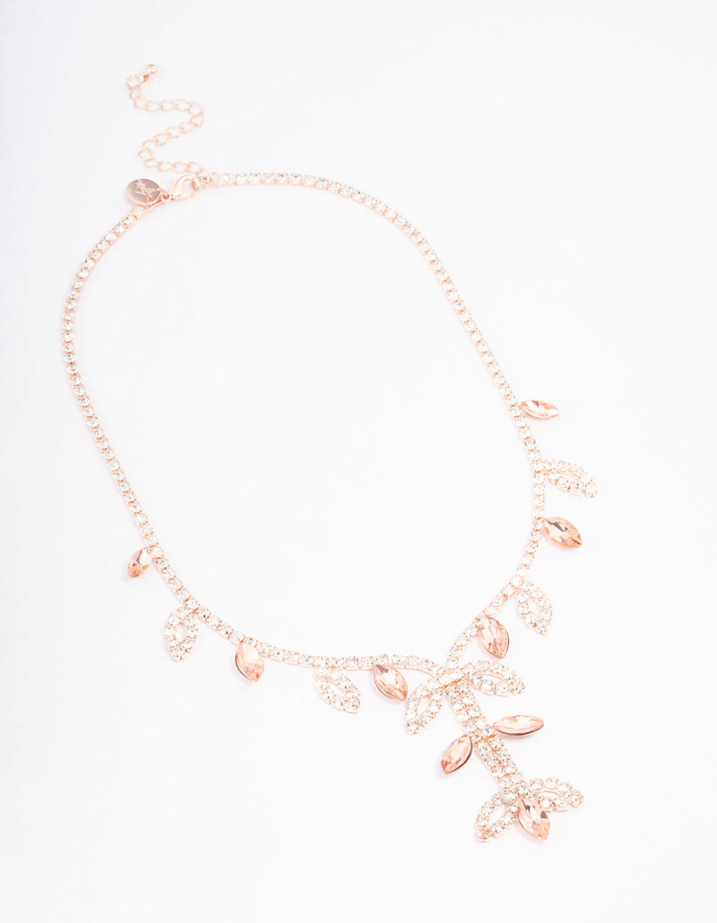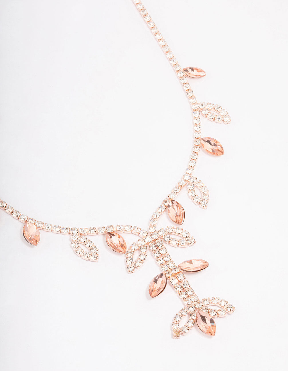 - This decorative necklace features a rose gold setting, embellished with diamante encrusted leaves for added interest.