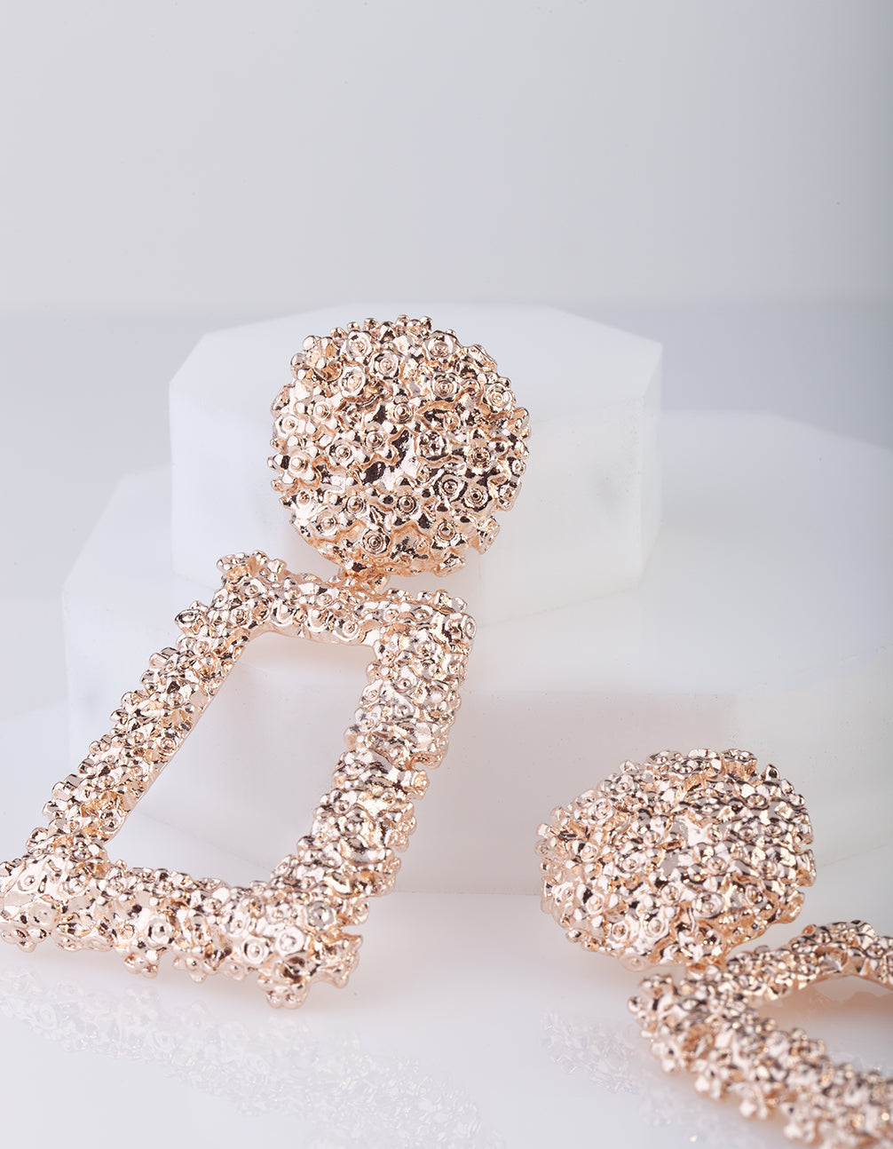 Textured Rose Gold Drop Earrings in a circular design. Rose gold toned pieces add a touch of feminine luxury to your looks. The pinkish hue has become one of the most fashionable metals. Textured rose gold-tone earrings in a circular design with stud fastening.