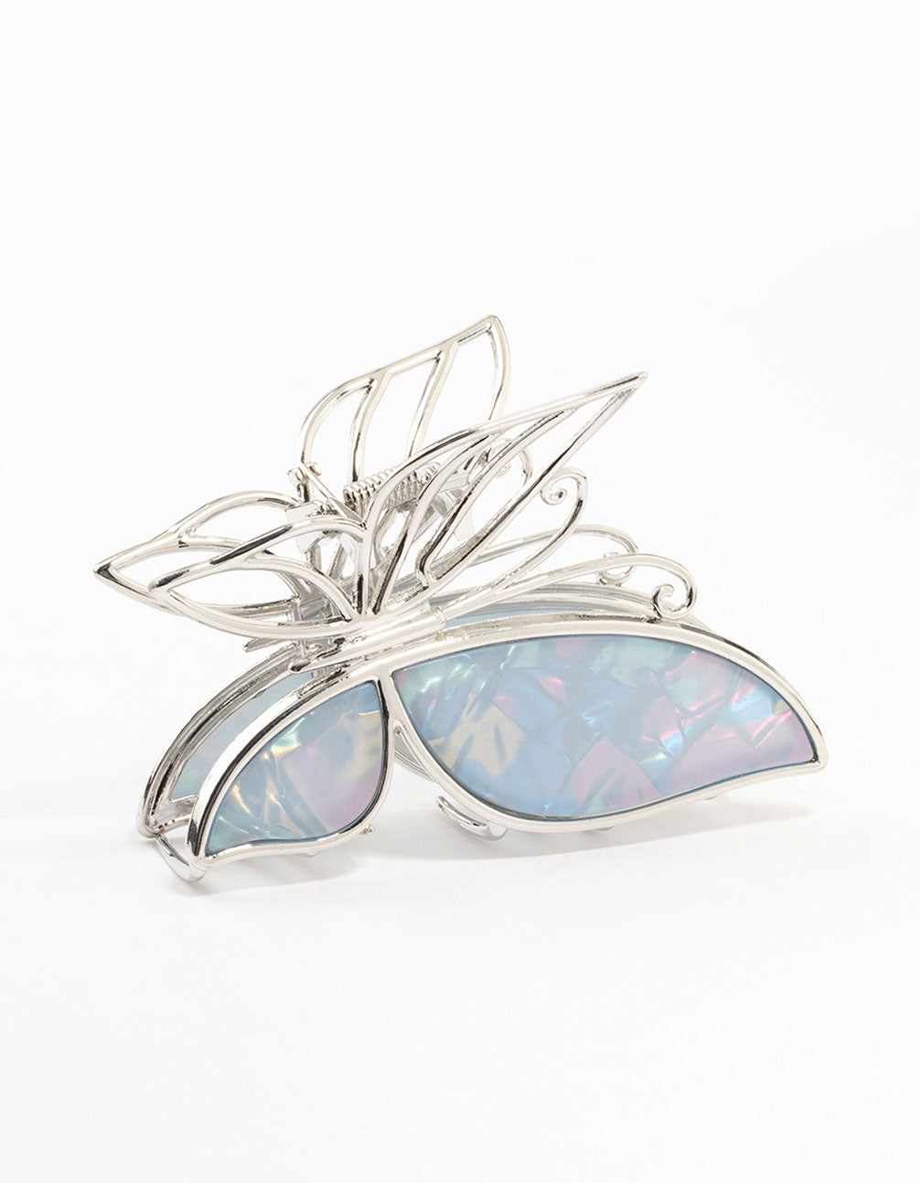 Unleash your style with the Silver Blue Butterfly Acrylic Claw Clip. This chic accessory blends sleek metal and shimmering acrylic to elevate any hairstyle instantly.Secure, comfortable, and versatile, it's the perfect day-to-night finishing touch.