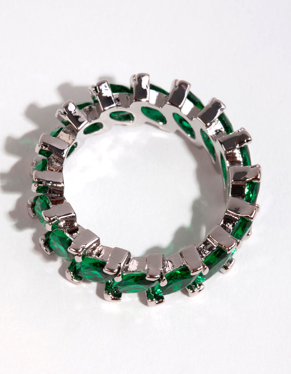 Sparkle with all the facets of a true diamond with cubic zirconia. These lab-created crystals are engineered to be indistinguishable from diamonds to the naked eye. This beautiful silver ring features a series of navette-cut cubic zirconia in an emerald hue. They're arranged in a diagonal baguette design.