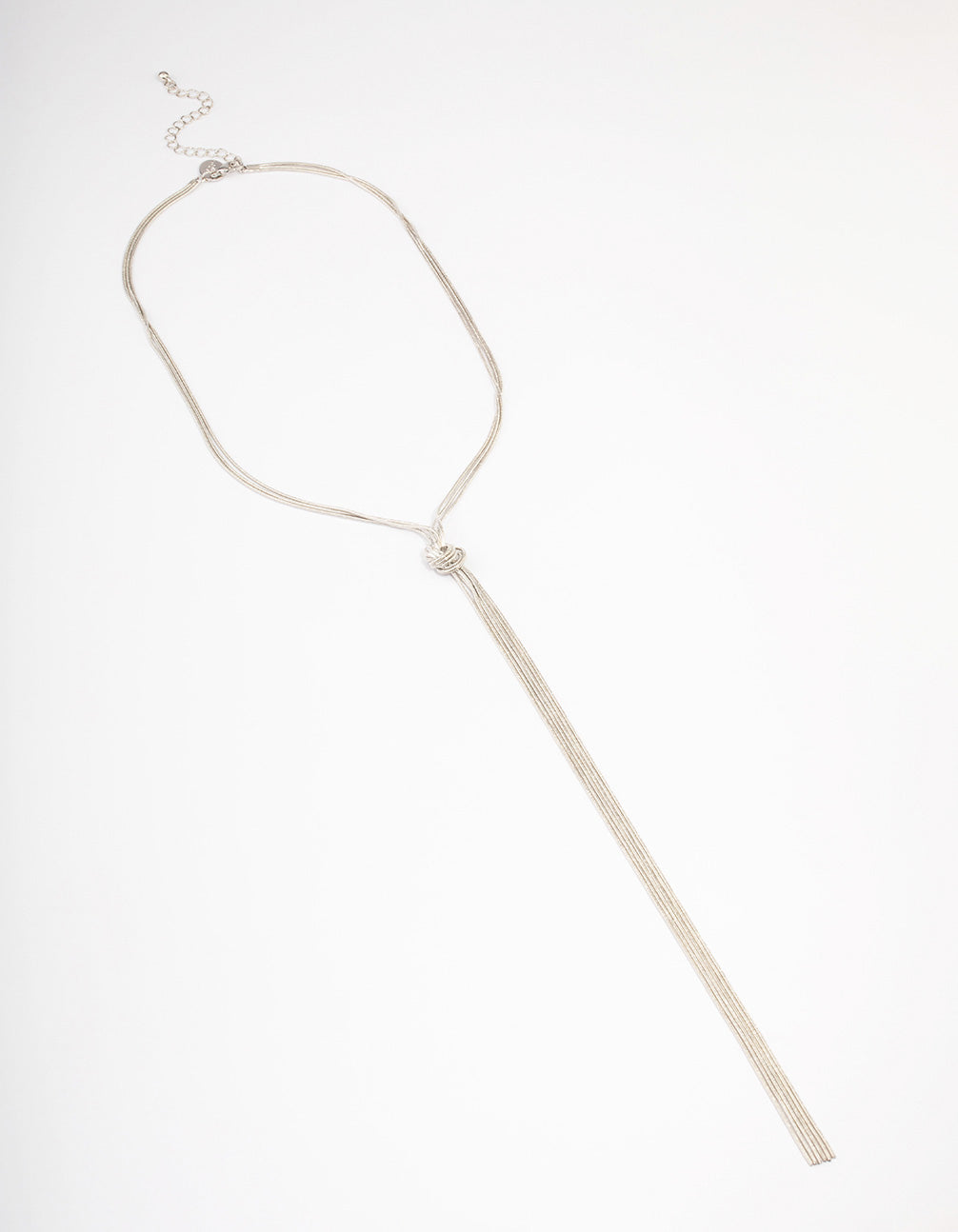 Add interest to your neckline with this silver-toned, lariat necklace. Designed with knotted tassels for added texture.