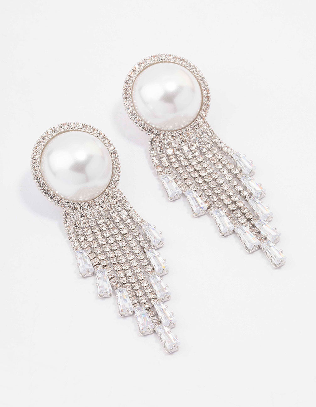 Silver Oversized Pearl Cup Chain Diamante Earrings