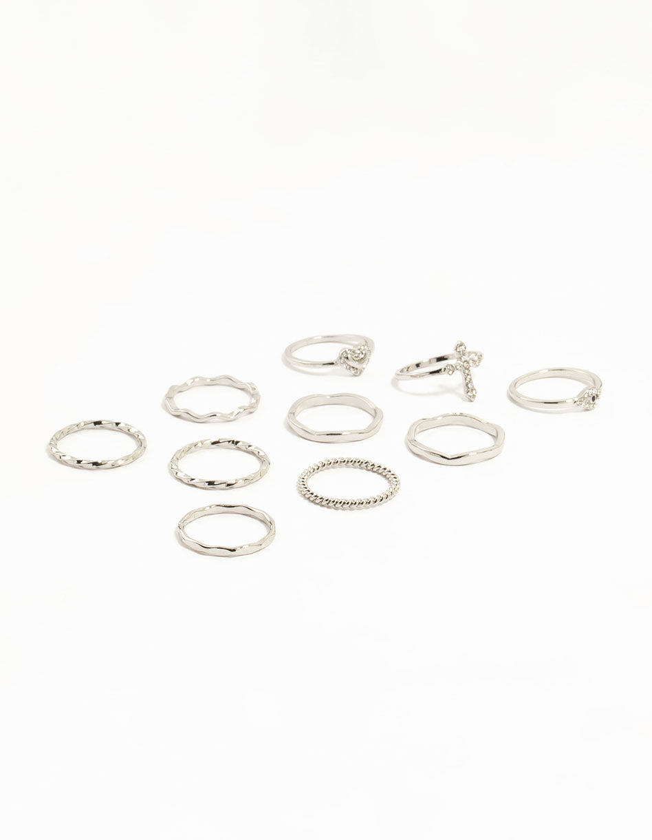 Silver Plated Gothic Cross & Twisted Stacking Rings 12-Pack