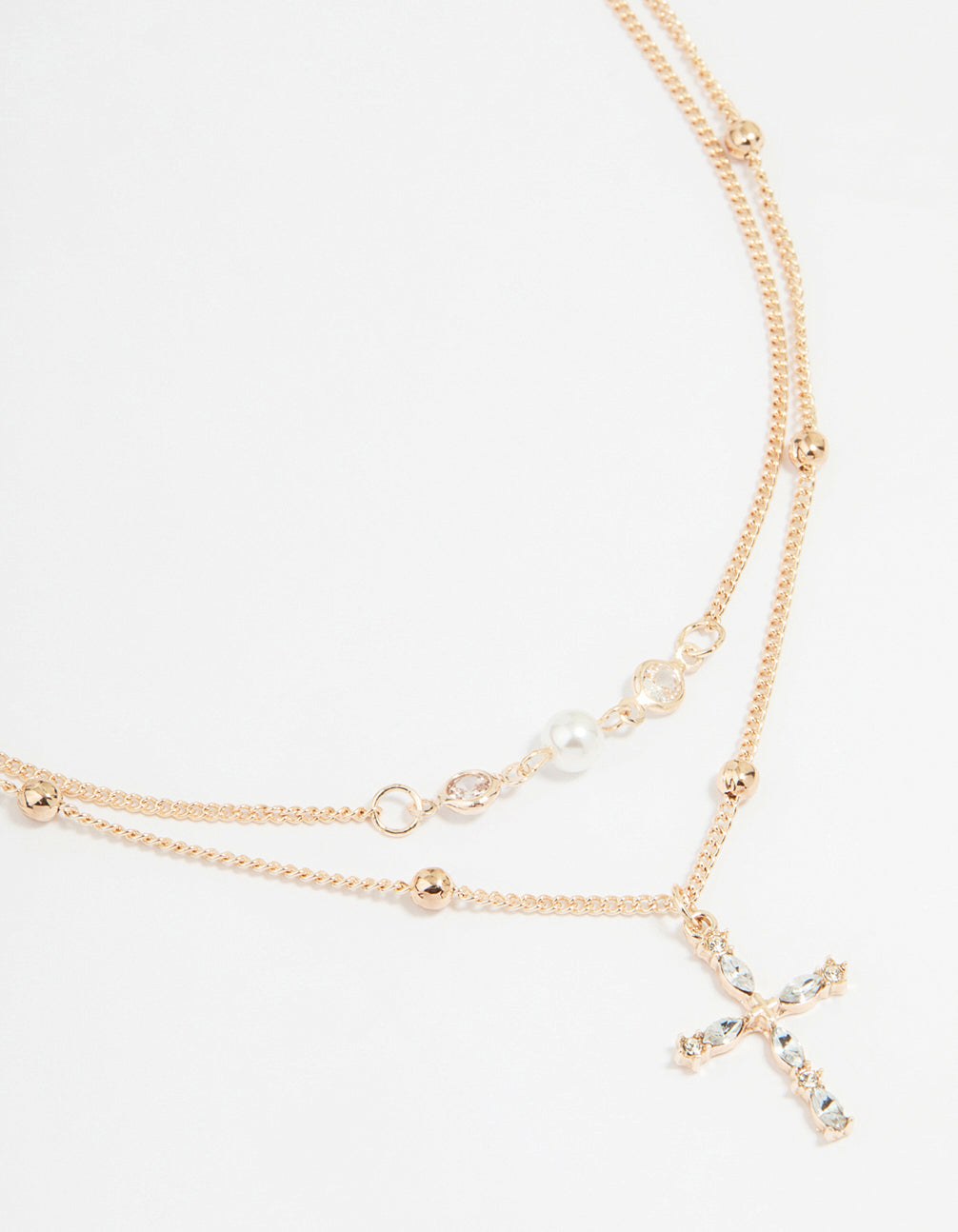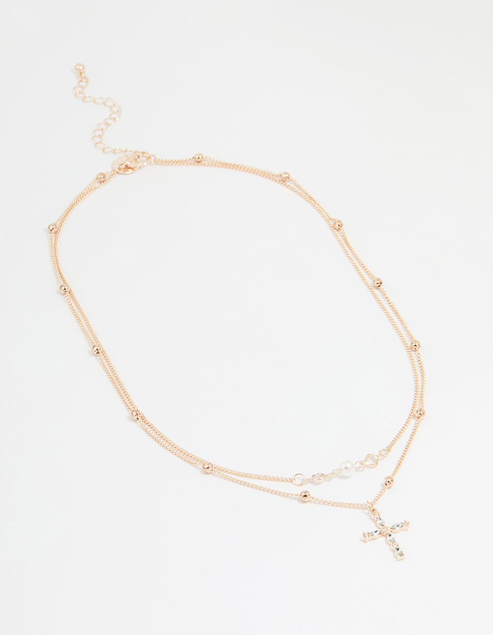Rose Gold Beaded Diamante Cross Layered Necklace