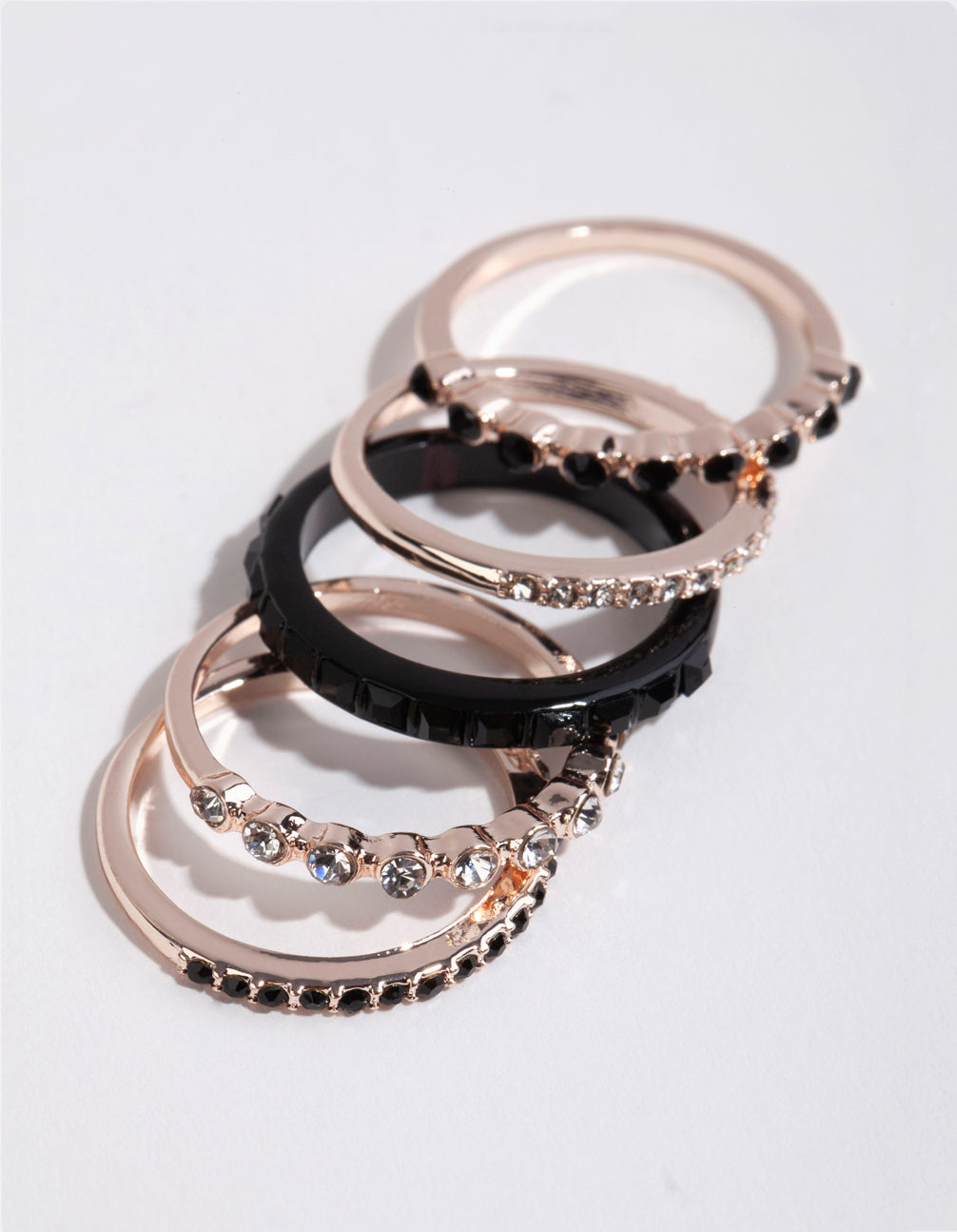 Lovisa loves a ring pack! This gorgeous ring set includes five rings in a mix of black and rose-gold tones. Stack them together for maxium impact.