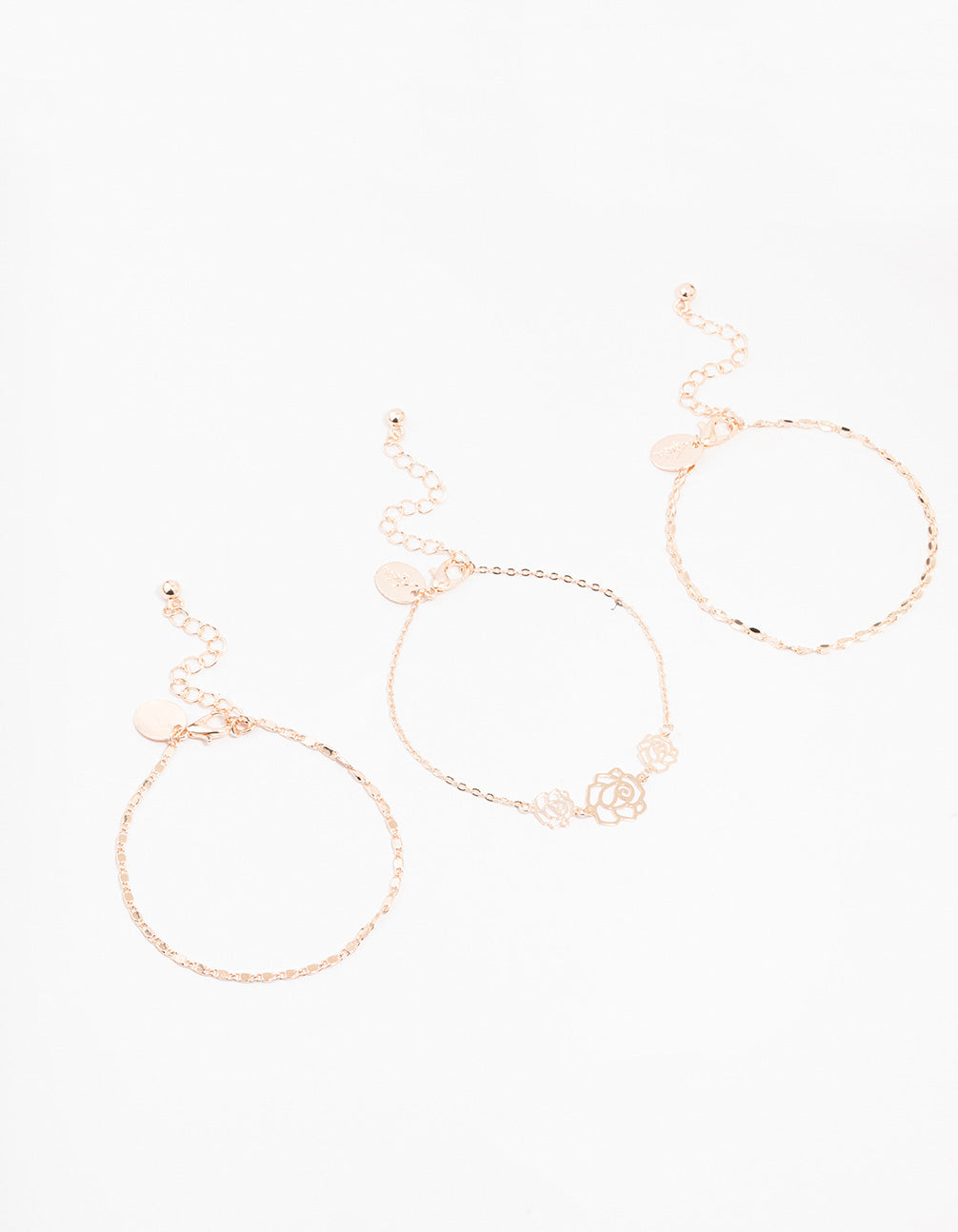 Curate your dream stack with this timeless, rose gold bracelet pack. This bracelet set includes three individual chain bracelets, each designed with a dainty profile and rose-shaped motifs.