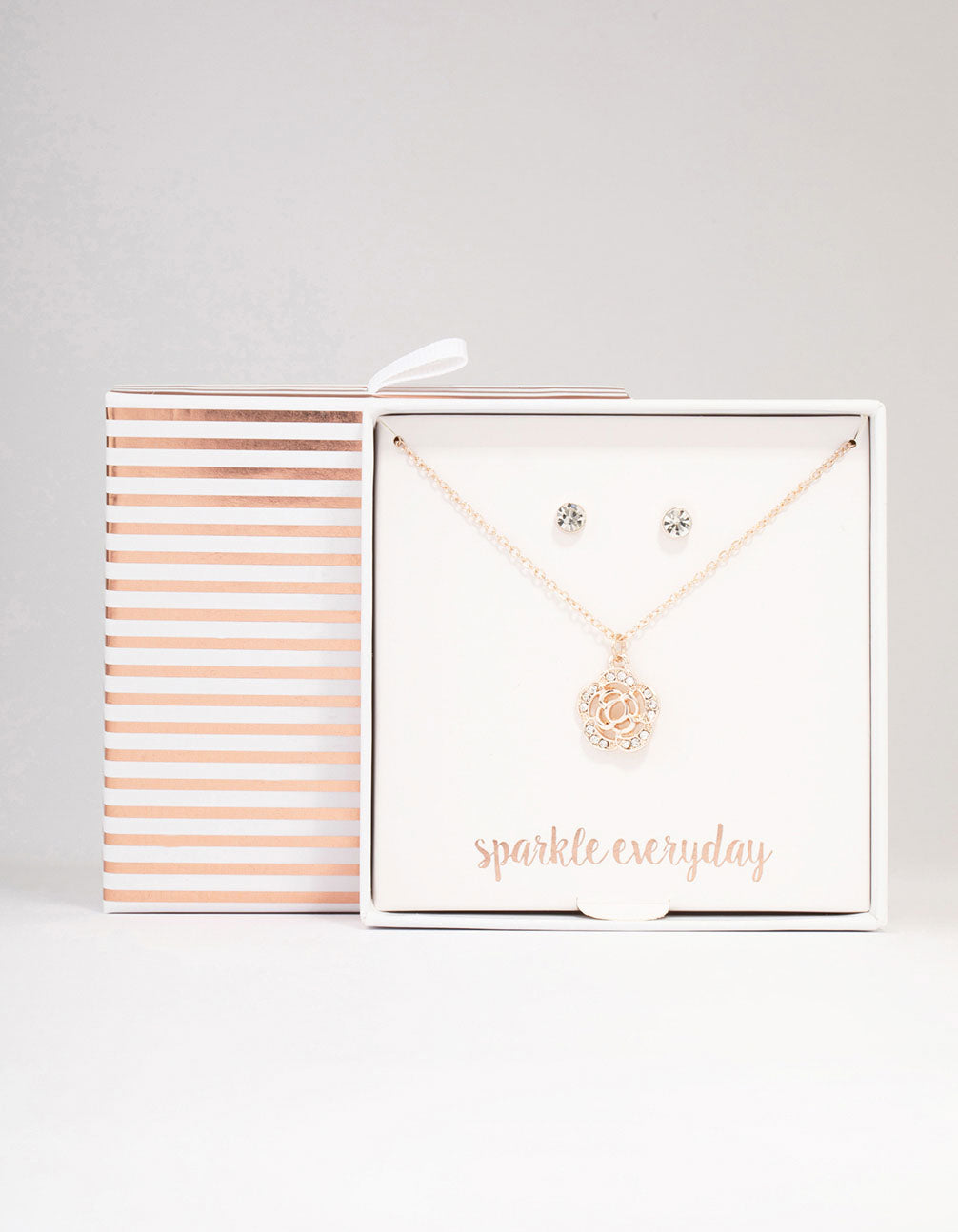 Complete your outfit with this timeless, rose gold jewellery set. This lovely set includes a dainty chain necklace and pair of adorning studs, designed with a delicate flower design.