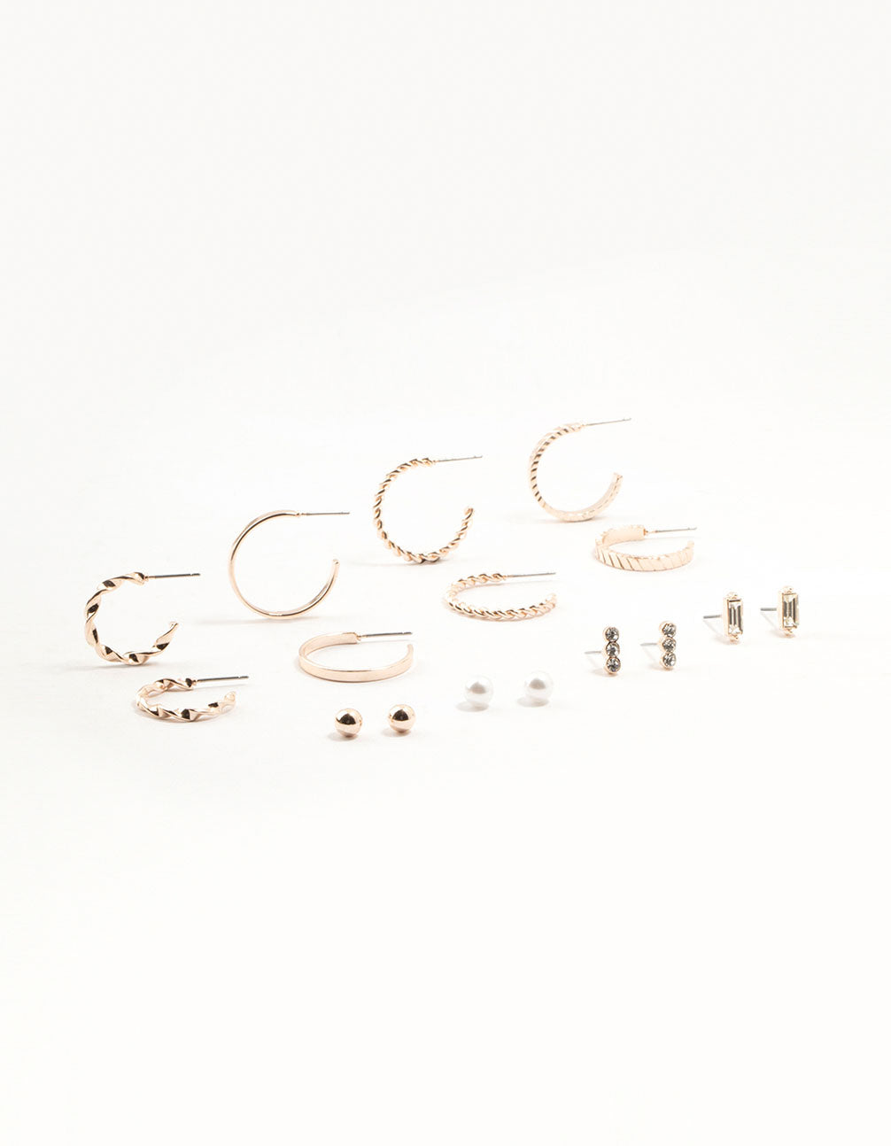 Create the ultimate ear stack with this set of 8 sleek earrings. Featuring twisted hoops, smooth designs, and sparkly diamante and pearl studs in a lovely rosy tone, these versatile pieces are perfect for stacking or wearing solo with any outfit.