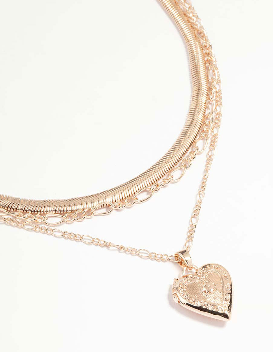 Add romance with this Rose Gold Figaro Heart Locket Layered Necklace. Featuring delicate layered chains in a warm rose gold finish and a heart-shaped locket pendant, this necklace is perfect for adding charm to any outfit.